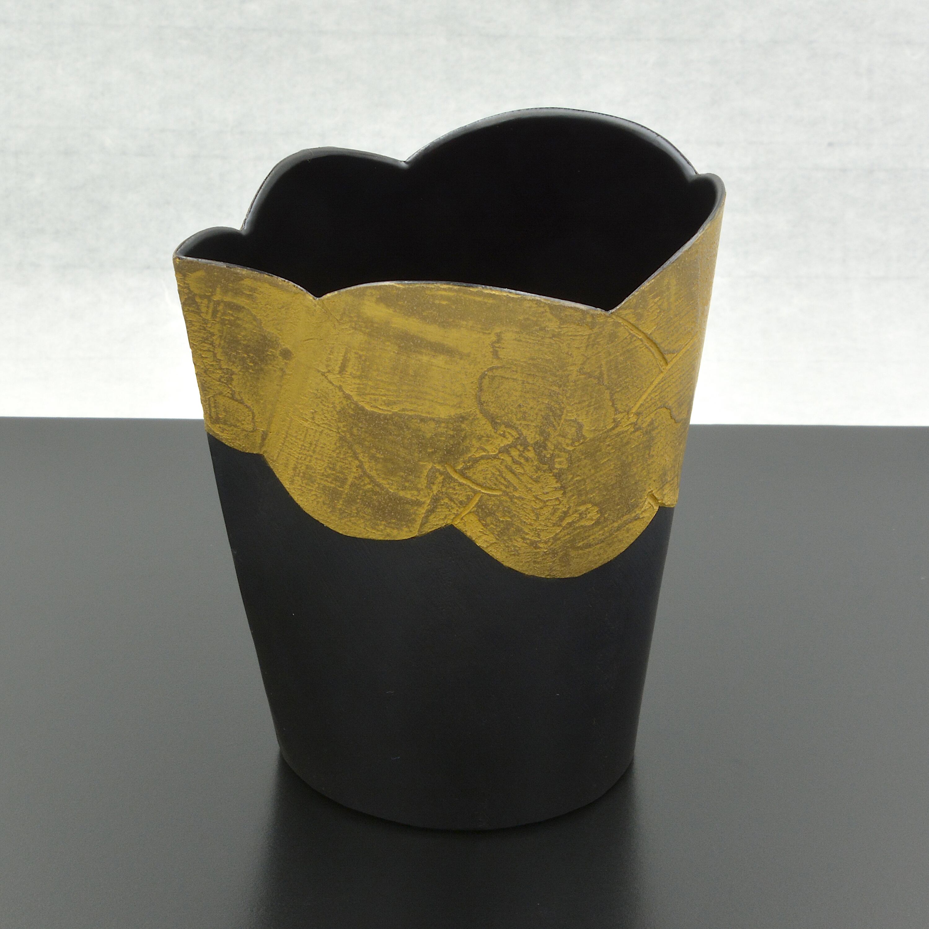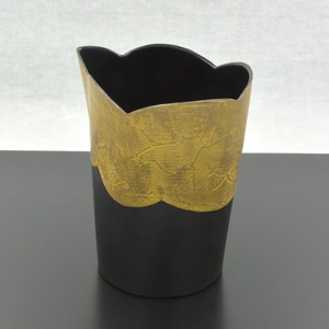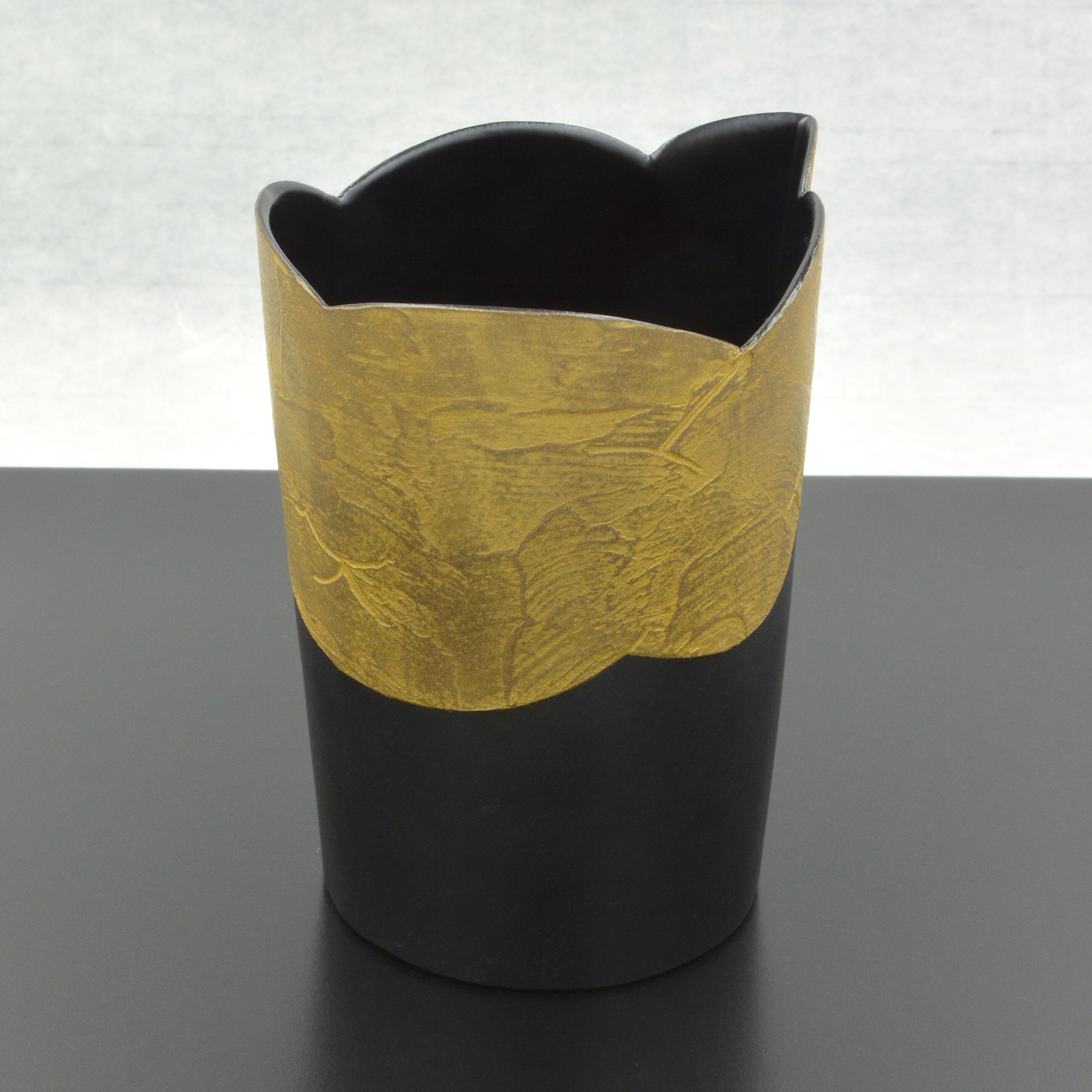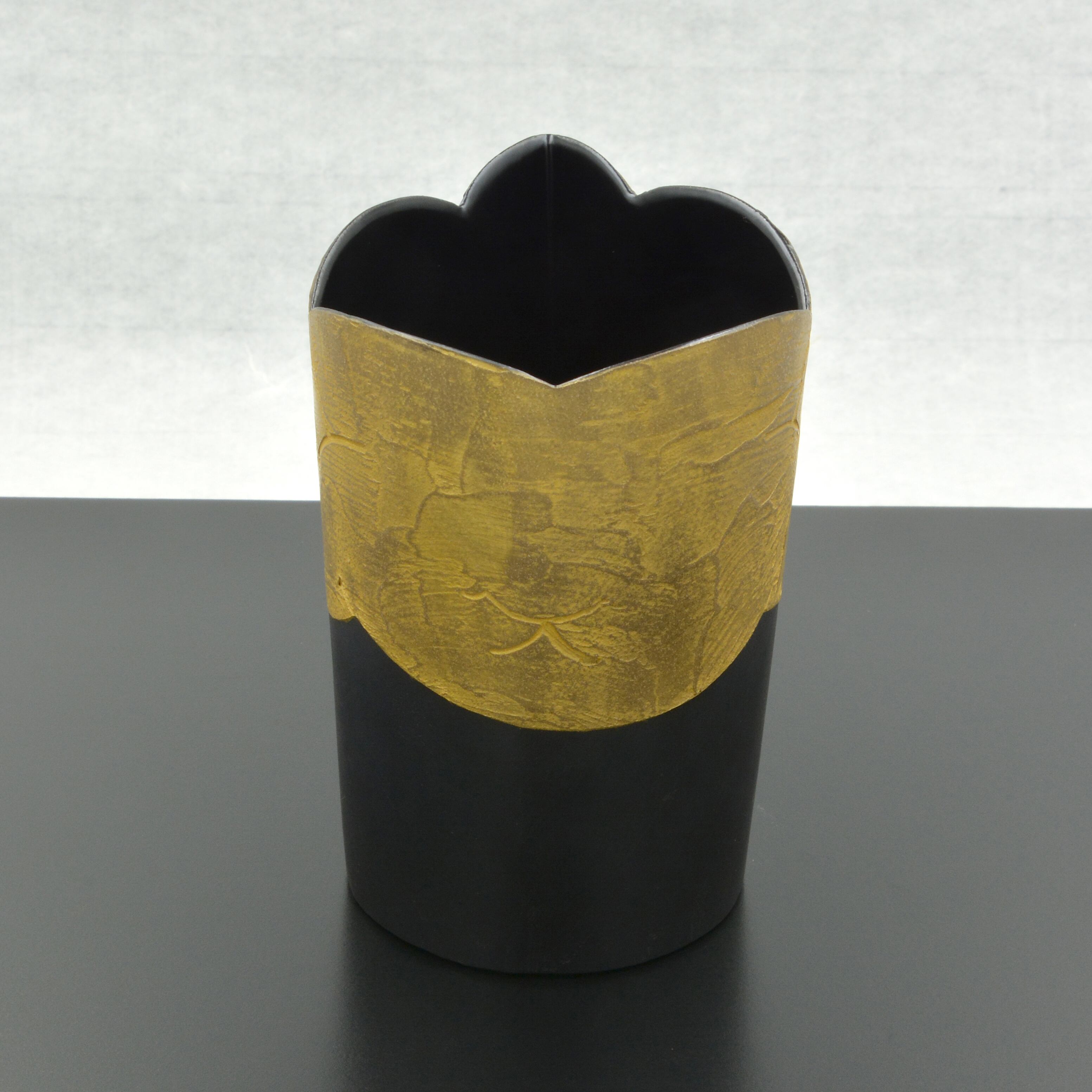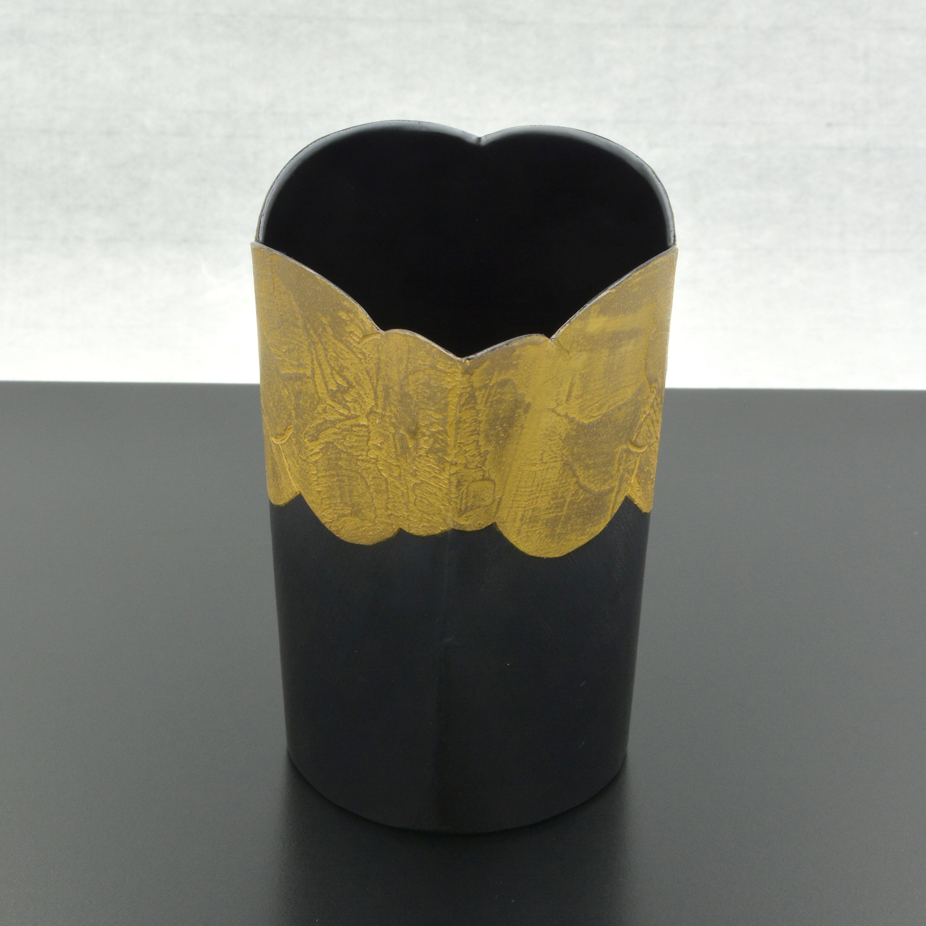 外側は持った時に滑りにくい独自の質感です。雲から雨が降り注ぐデザインは金粉で仕上げ、内側はシンプルにマットな黒漆で仕上げています。