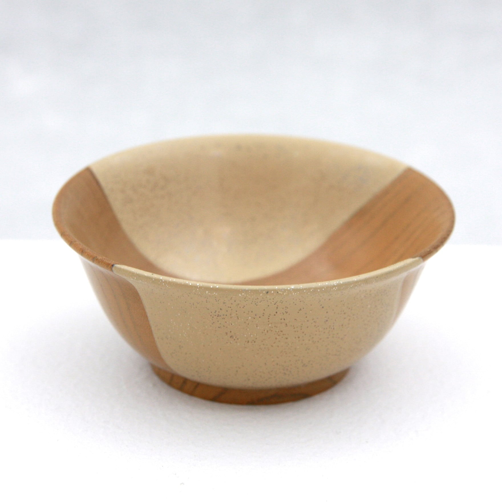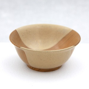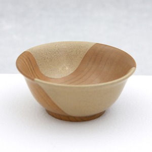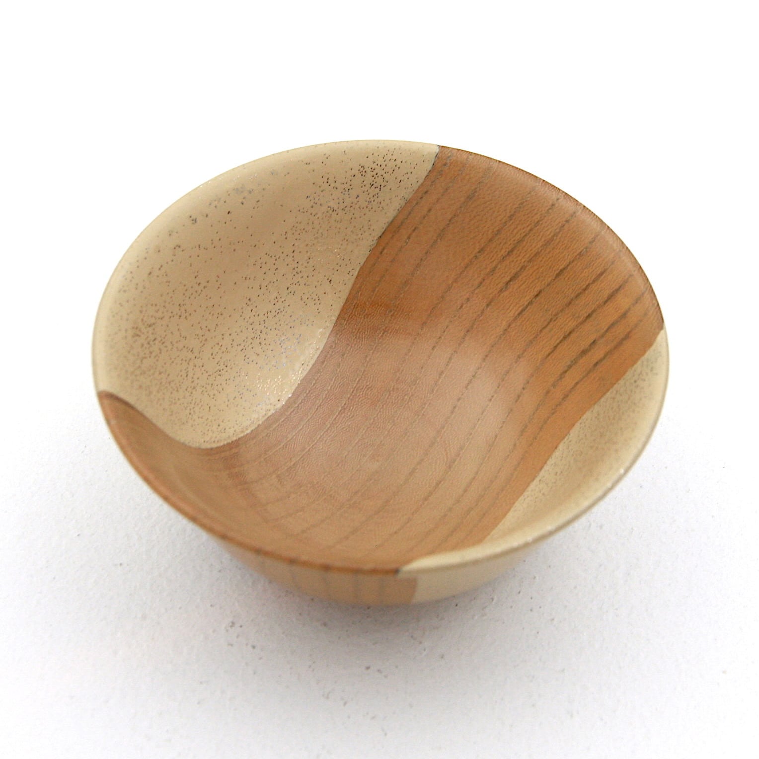 欅の年輪をデザインに落とし込んだ盃です。漆を刷り込んでは拭き上げることを7回繰り返して木目の美しさを生かしてその一部に金粉、銀粉をちりばめて飴色の漆で閉じ込めました。