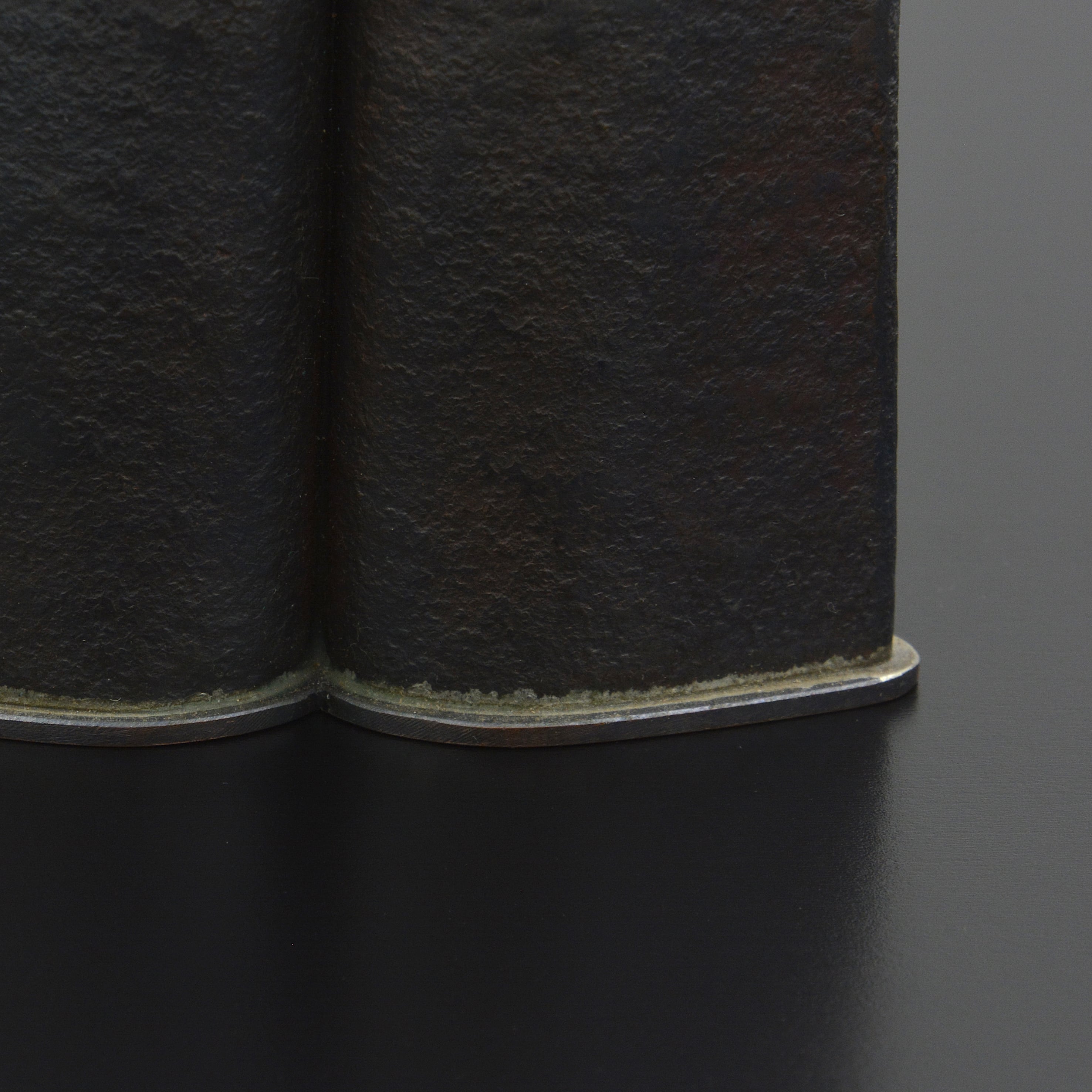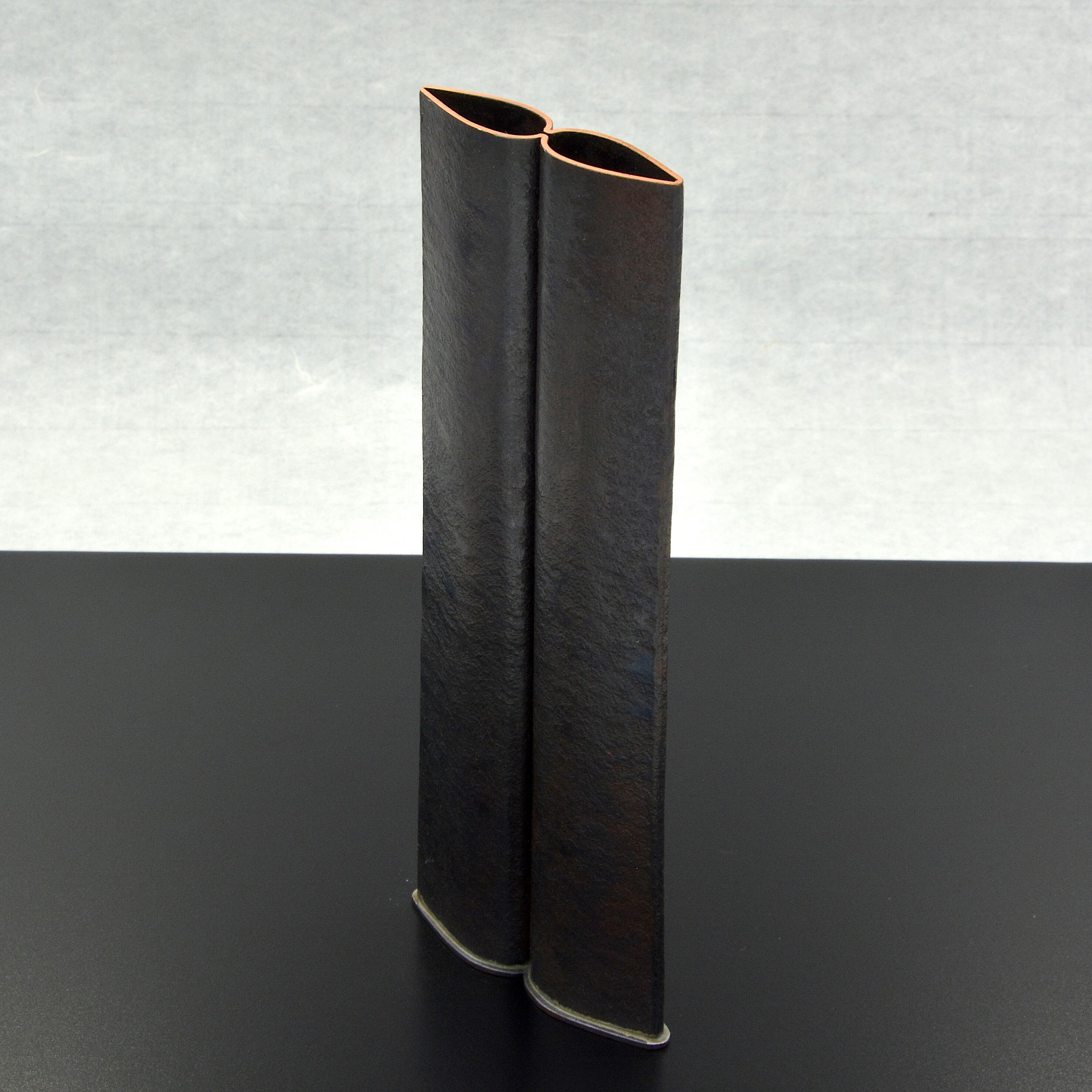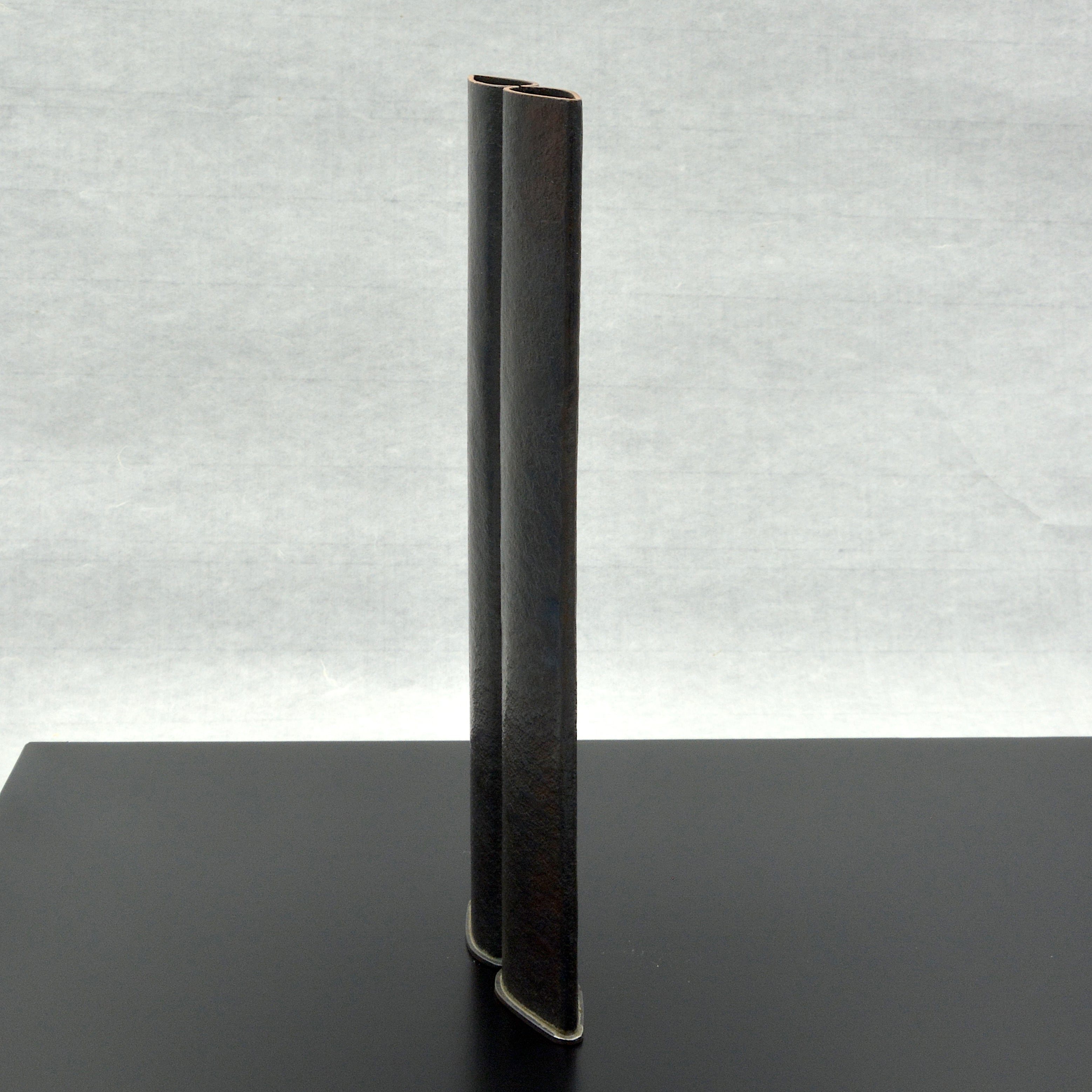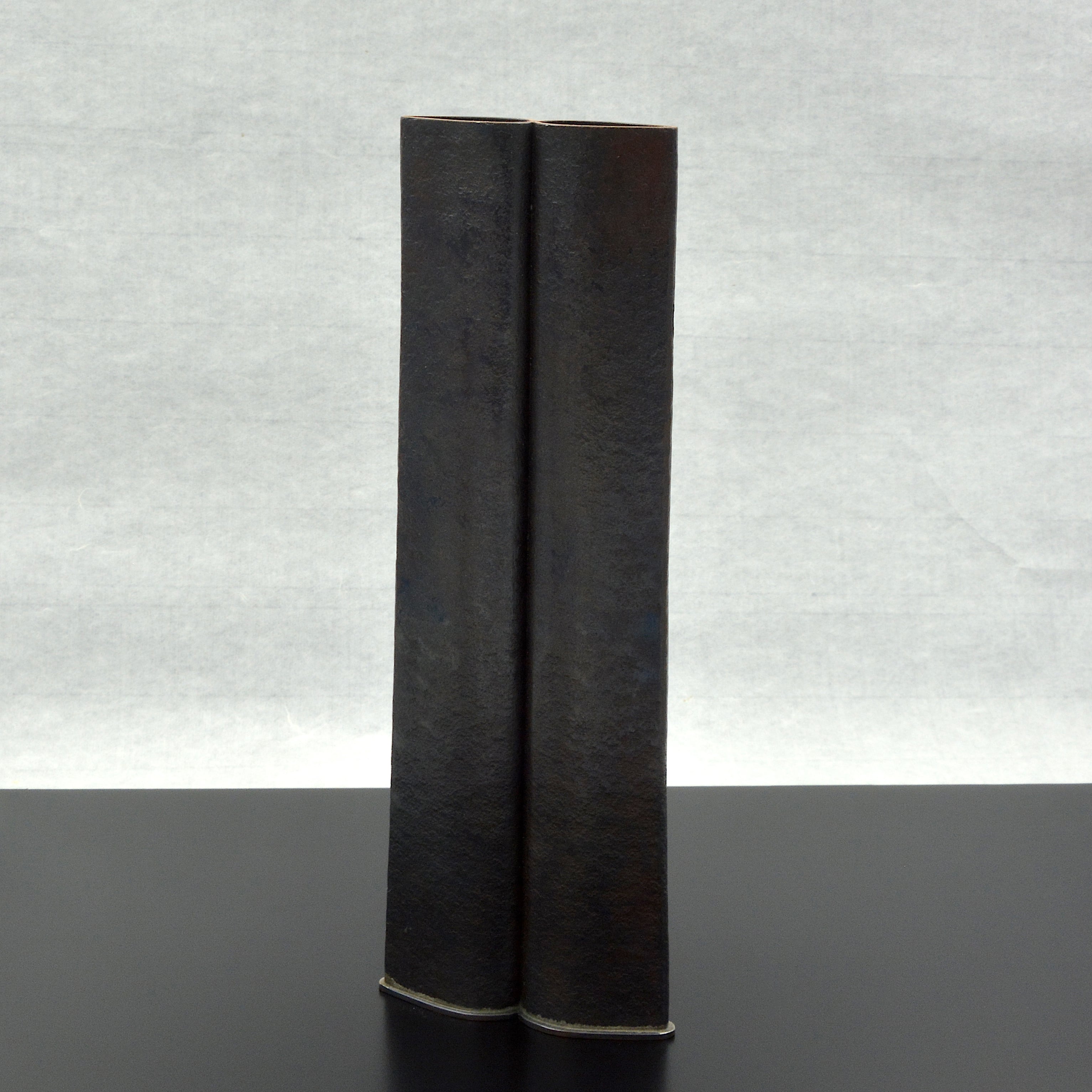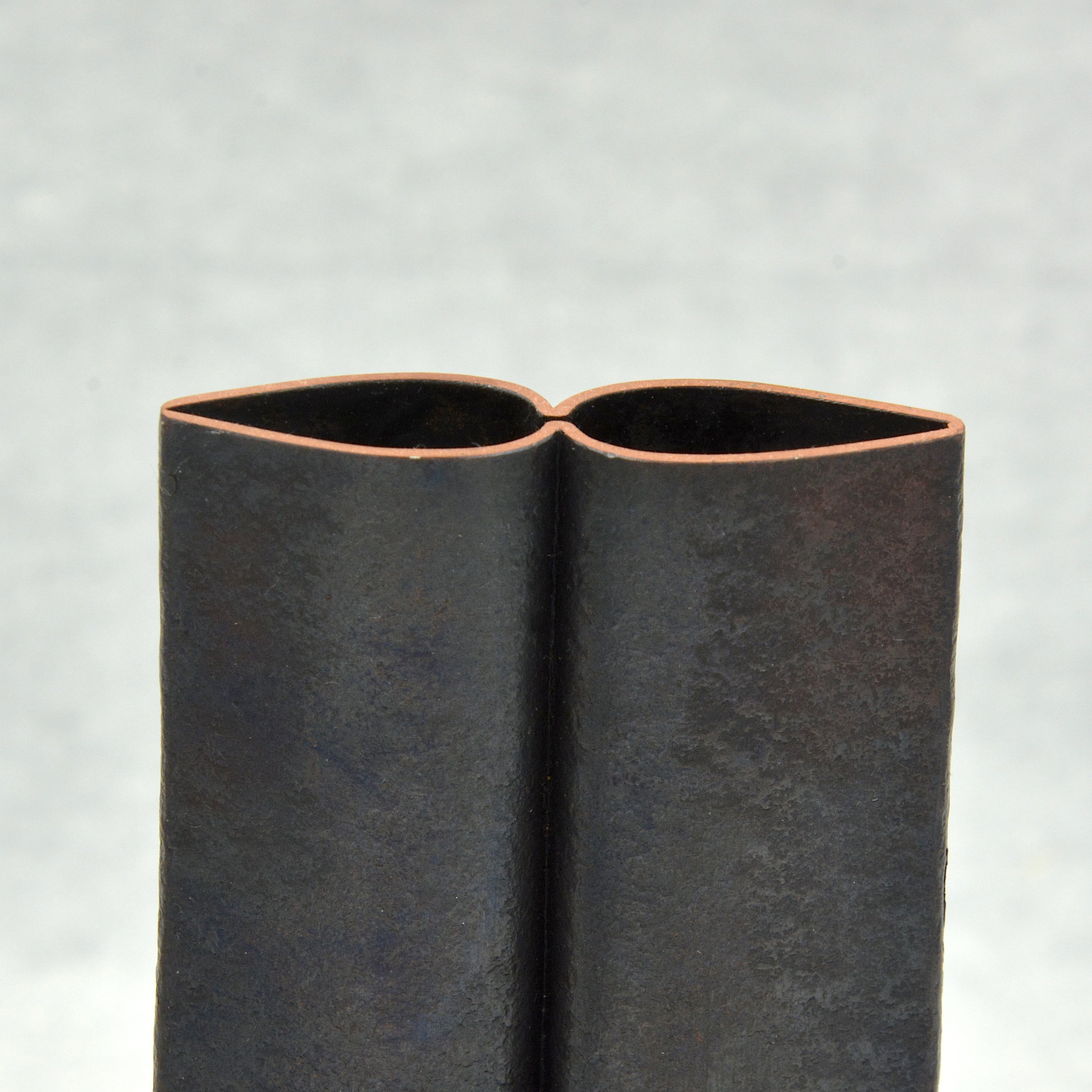 そびえ立つような姿の銅の花器シリーズ。銅板を金槌で丁寧に叩いて表面の模様を作っています。一輪挿しは切り口の形が美しく、オブジェとしても飾って頂けます。仕上げは硫化仕上げの後、蜜蝋を施し、自然な風合いを出しています。