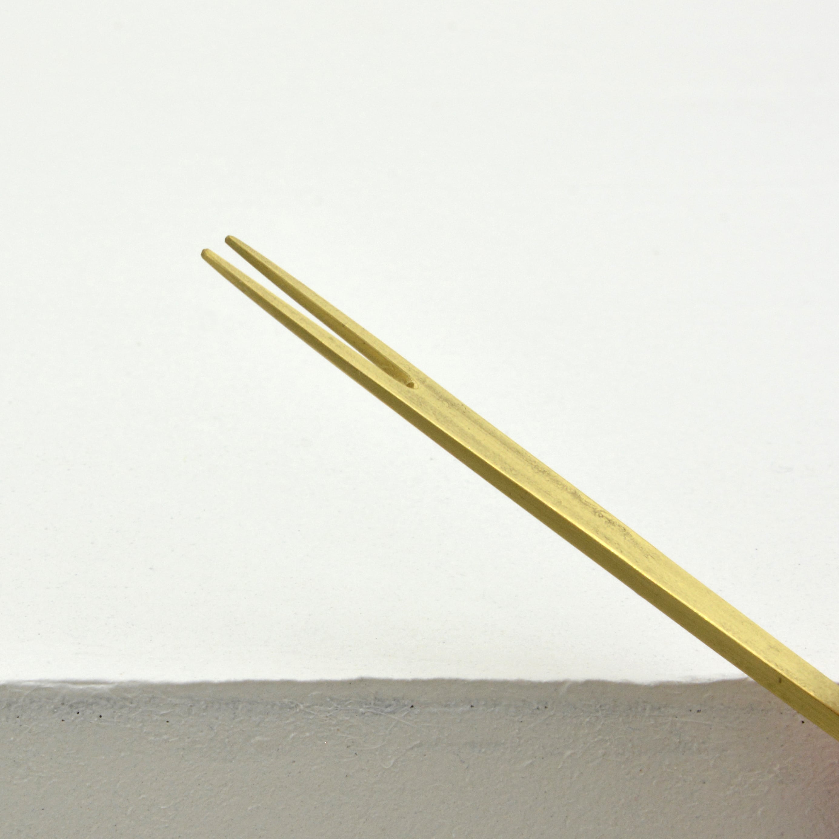 真鍮の金色と岩目の金槌の模様が暖かい雰囲気です。仕上げには口に入っても安心の蜜蝋をコーティングしています。一点一点、最後の仕上げまで手作りで製作しています。持ち手の端には作者の刻印が入っています。和菓子に合わせるのはもちろん、チョコレートなどの洋菓子やお酒と一緒にチーズを食べる時にもちょうど良い品です。
