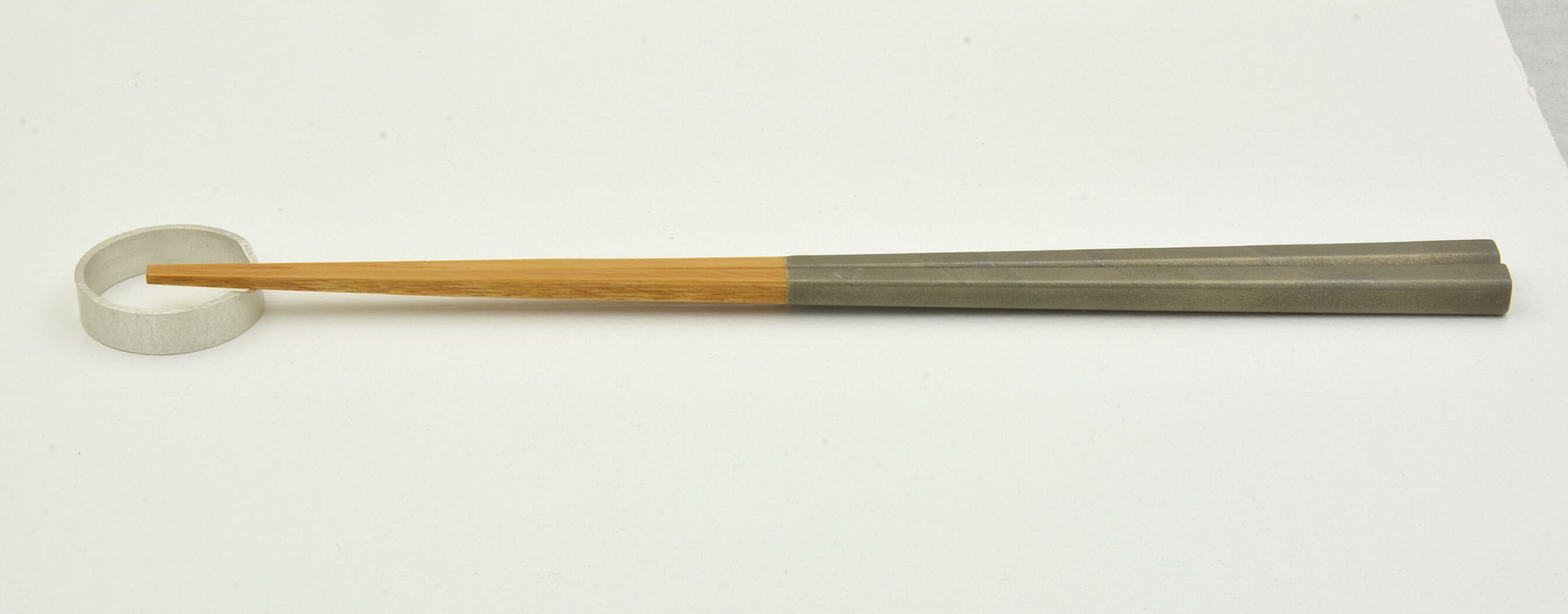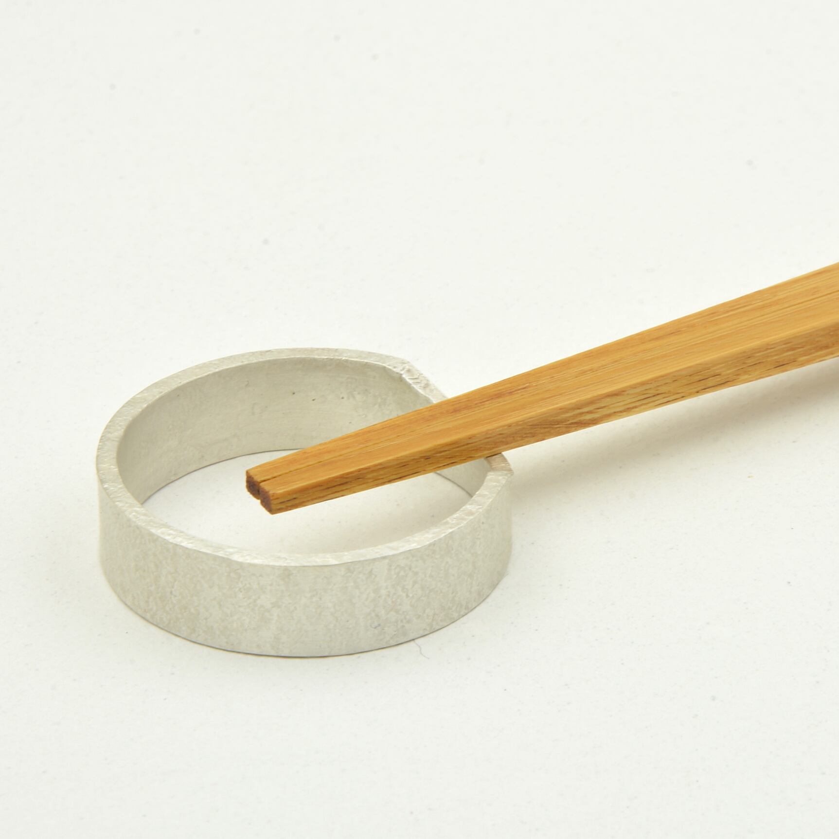 真鍮に岩目の金槌で模様を入れた後に銀鍍金を施した箸置き。仕上げには口に入っても安心の蜜蝋をコーティングしています。円形の一端にくぼみがあり、そこに端の先端をかけます。輝く円形はお正月のお食事やお祝いの席に良く合います。