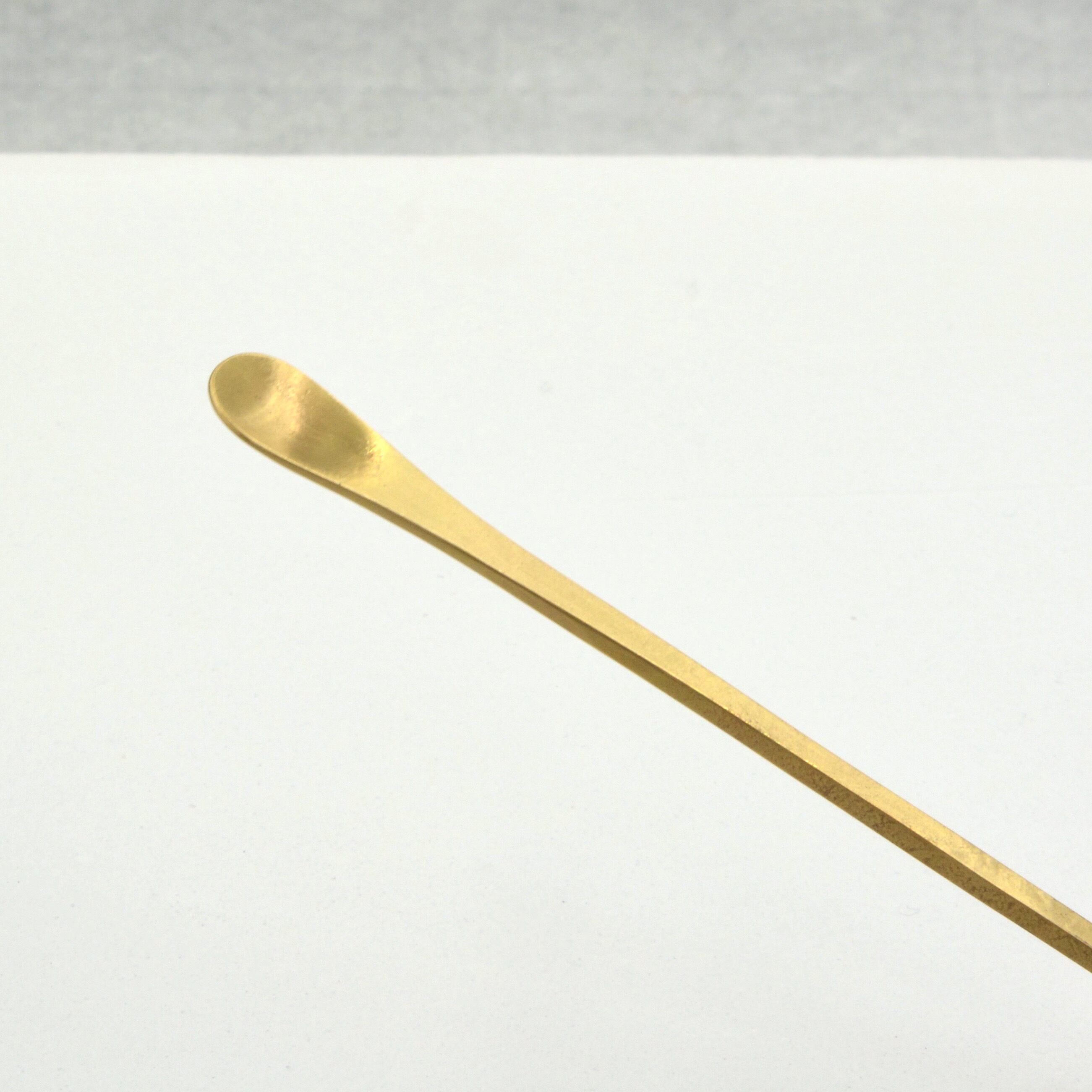 真鍮の金色と岩目の金槌の模様が暖かい雰囲気の菓子スプーン。仕上げには口に入っても安心の蜜蝋をコーティングしています。一点一点、最後の仕上げまで手作りで製作しています。持ち手の端には作者の刻印が入っています。ティースプーンやマドラーなどに良いサイズです。