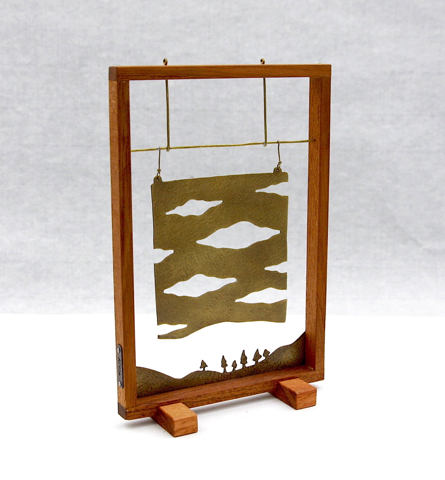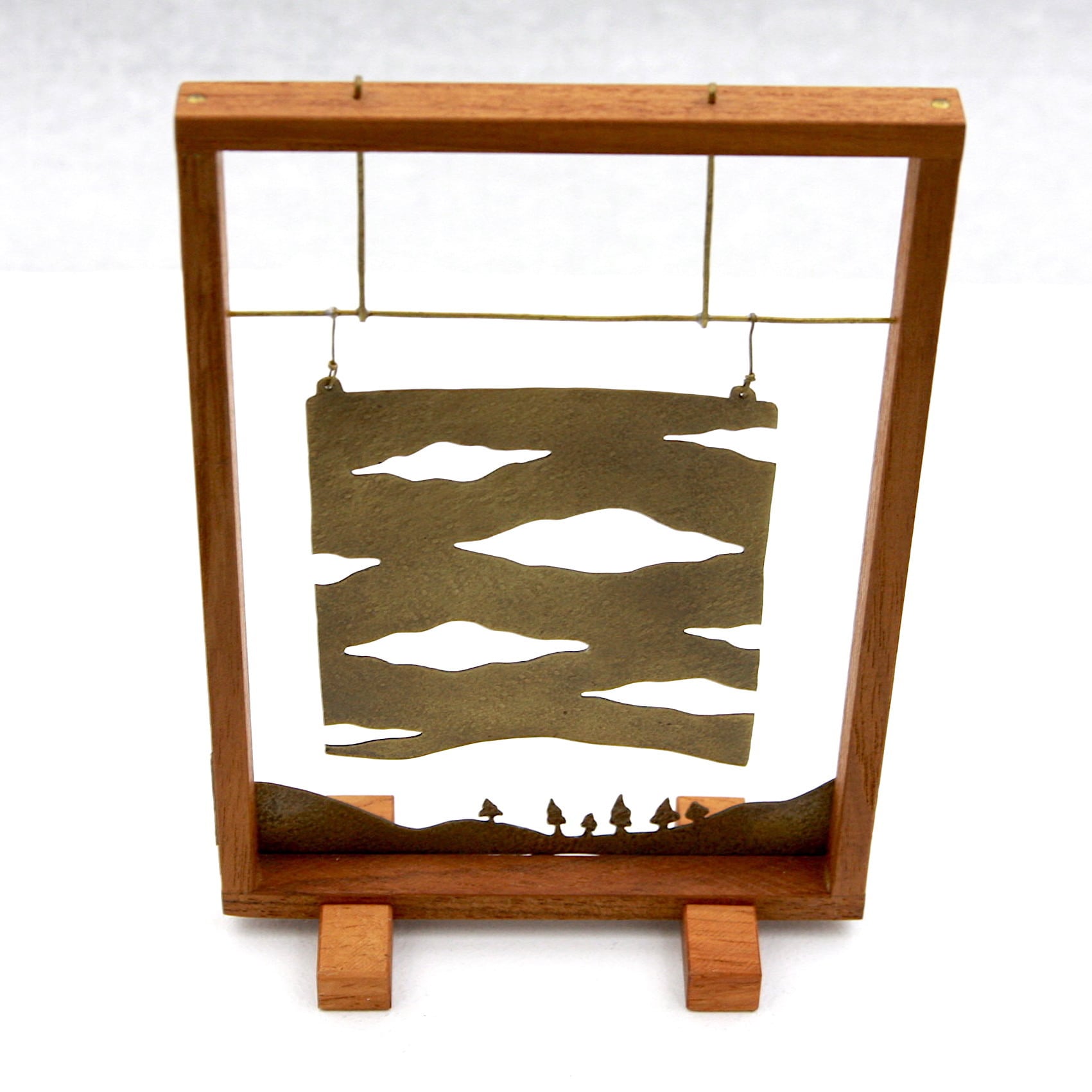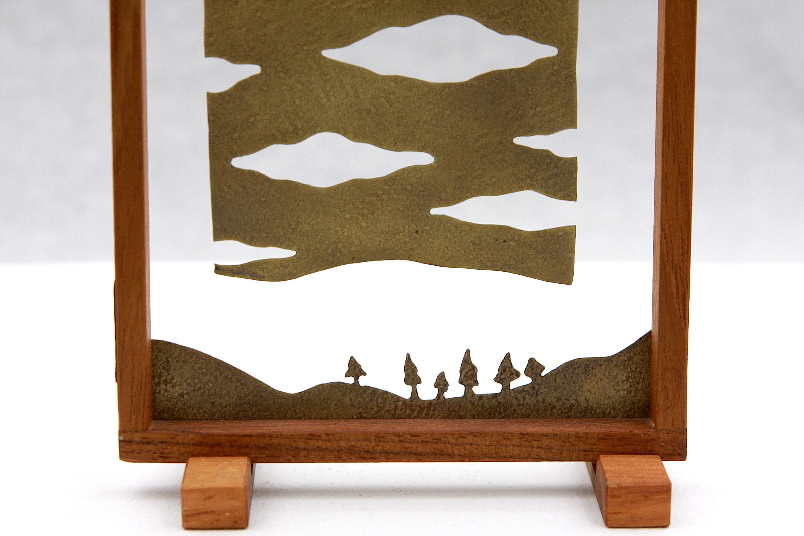 チーク材の木枠の中に、真鍮を使って風景を作った作品。真鍮のモチーフの1つ1つが手作りで暖かみがあり、それぞれに異なった金槌の目が入っています。壁にかけることはもちろん、付属の台座を使えばテーブルなどに置くことも出来ます。