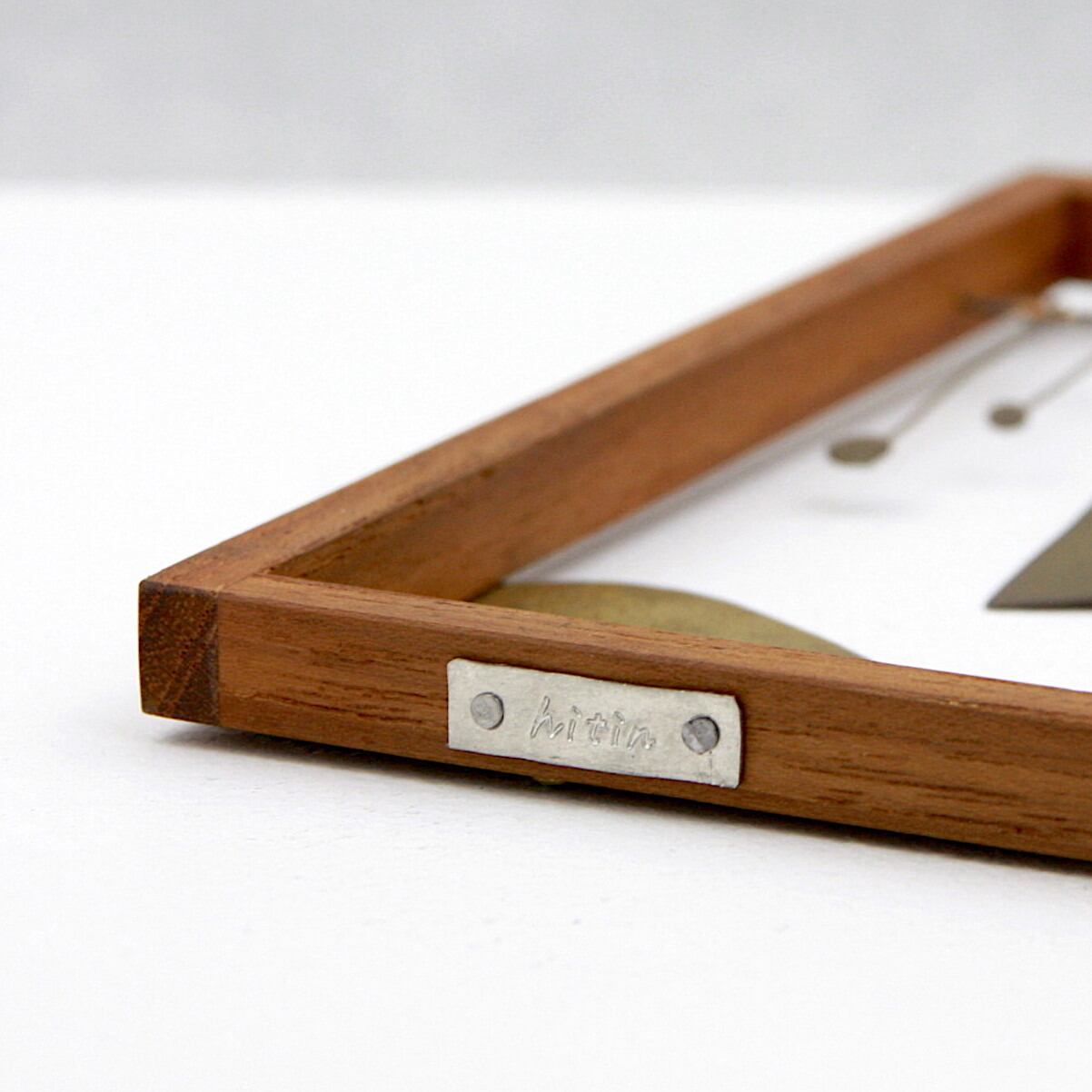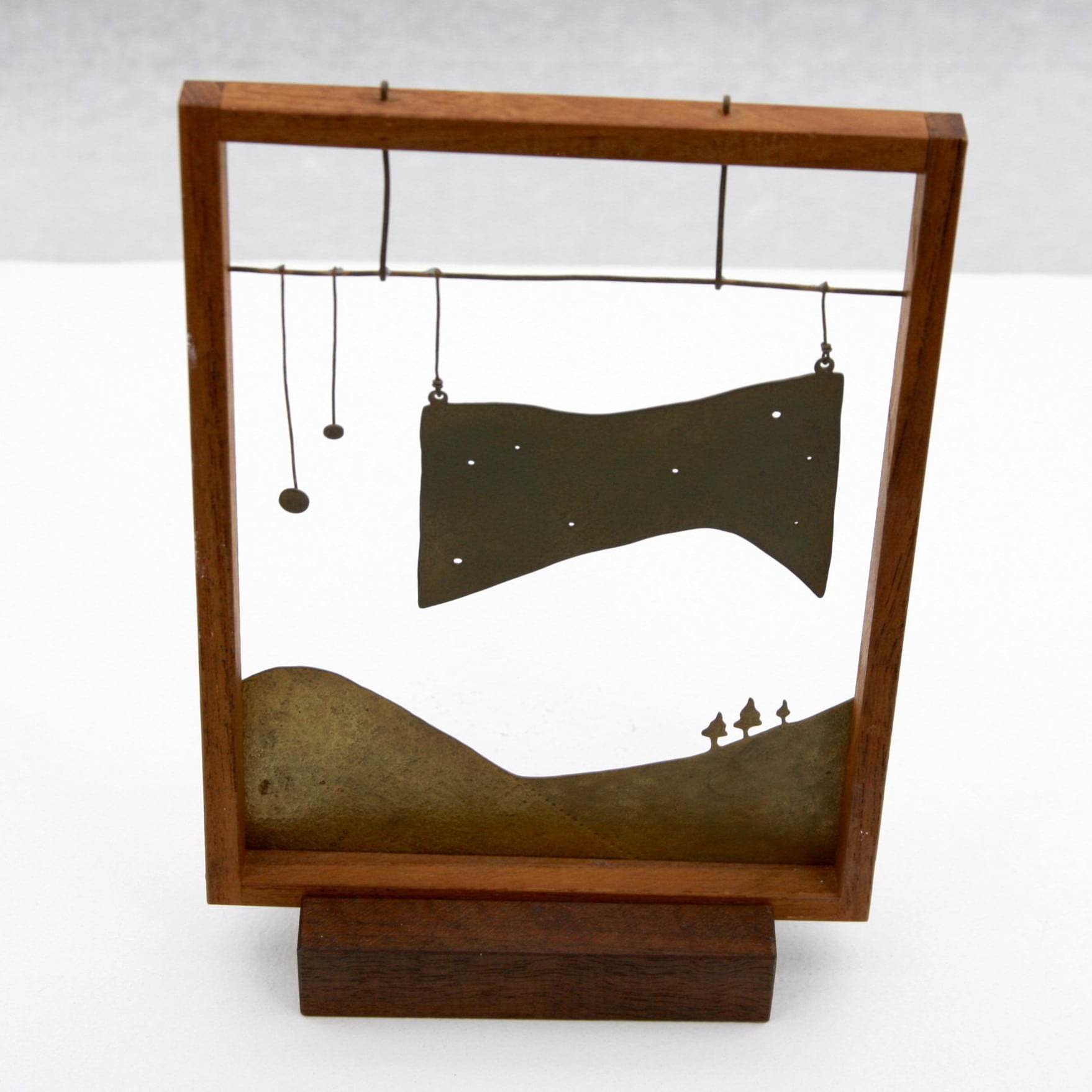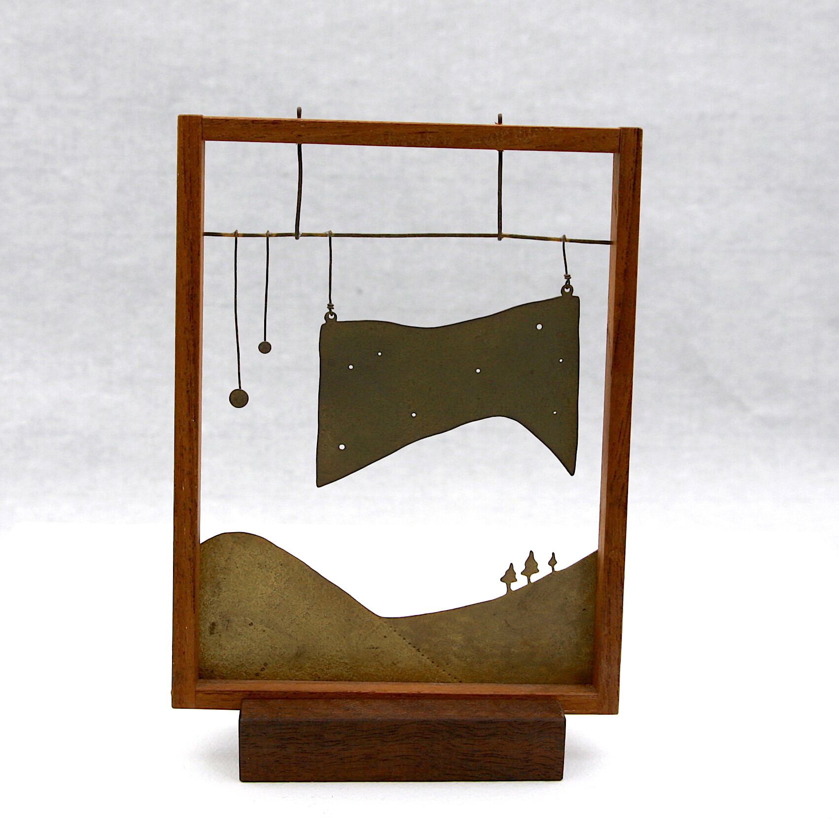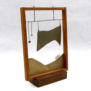 チーク材の木枠の中に、真鍮を使って風景を作った作品。真鍮のモチーフの1つ1つが手作りで暖かみがあり、それぞれに異なった金槌の目が入っています。壁にかけることはもちろん、付属の台座を使えばテーブルなどに置くことも出来ます。