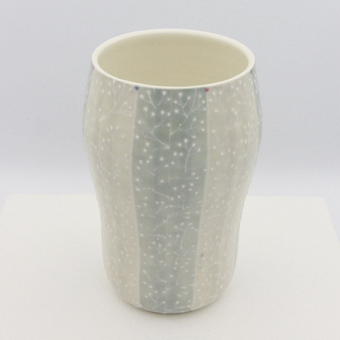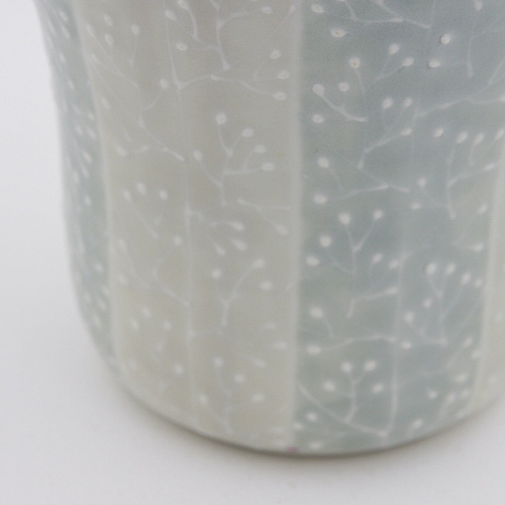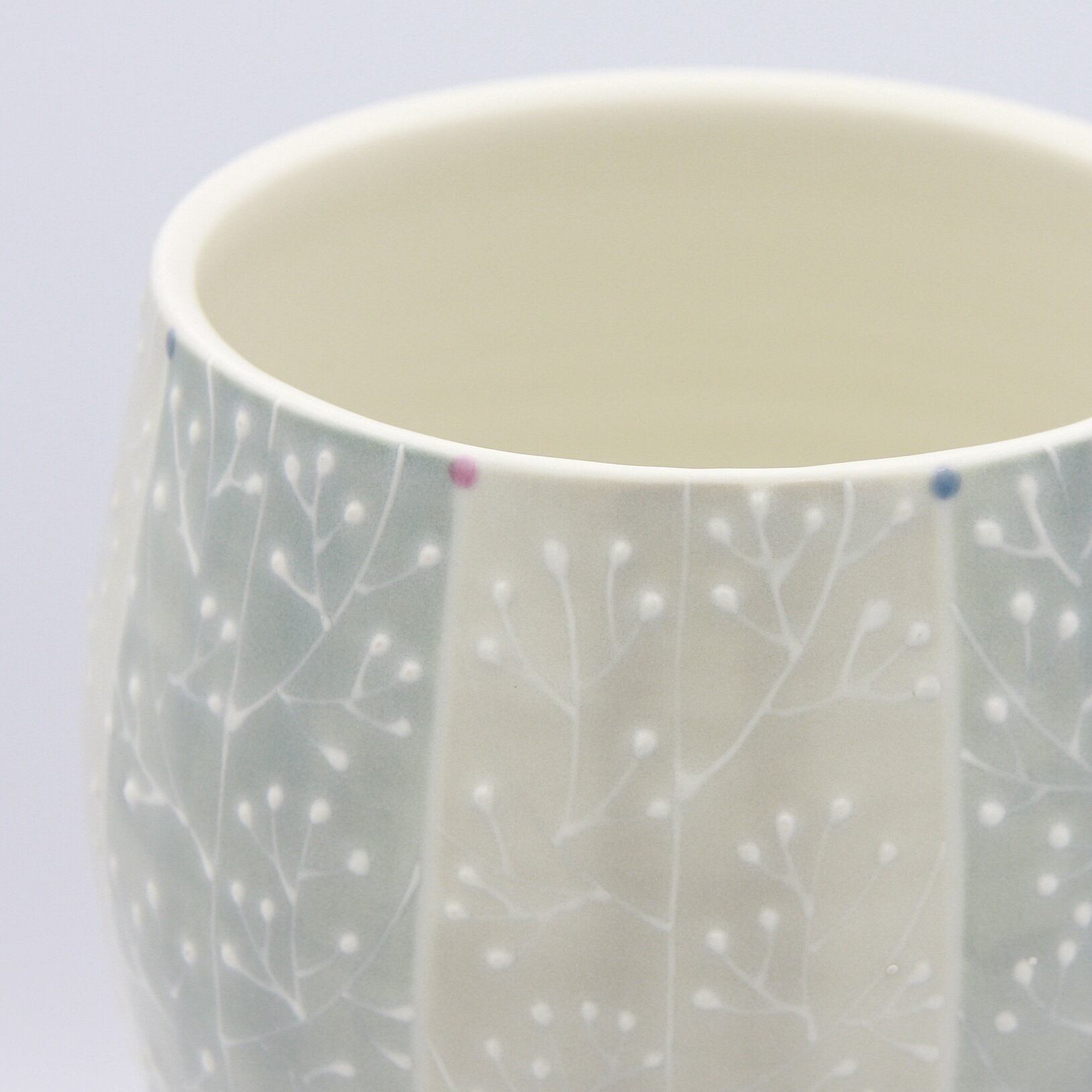 下絵具で全体に色付けし、イッチン(※)で木立の模様を描いています。本焼き後の上絵付けでピンクとブルーのドットを色付けしポイントにしています。生けた花が映えるよう色味を抑えたデザインとなっています。