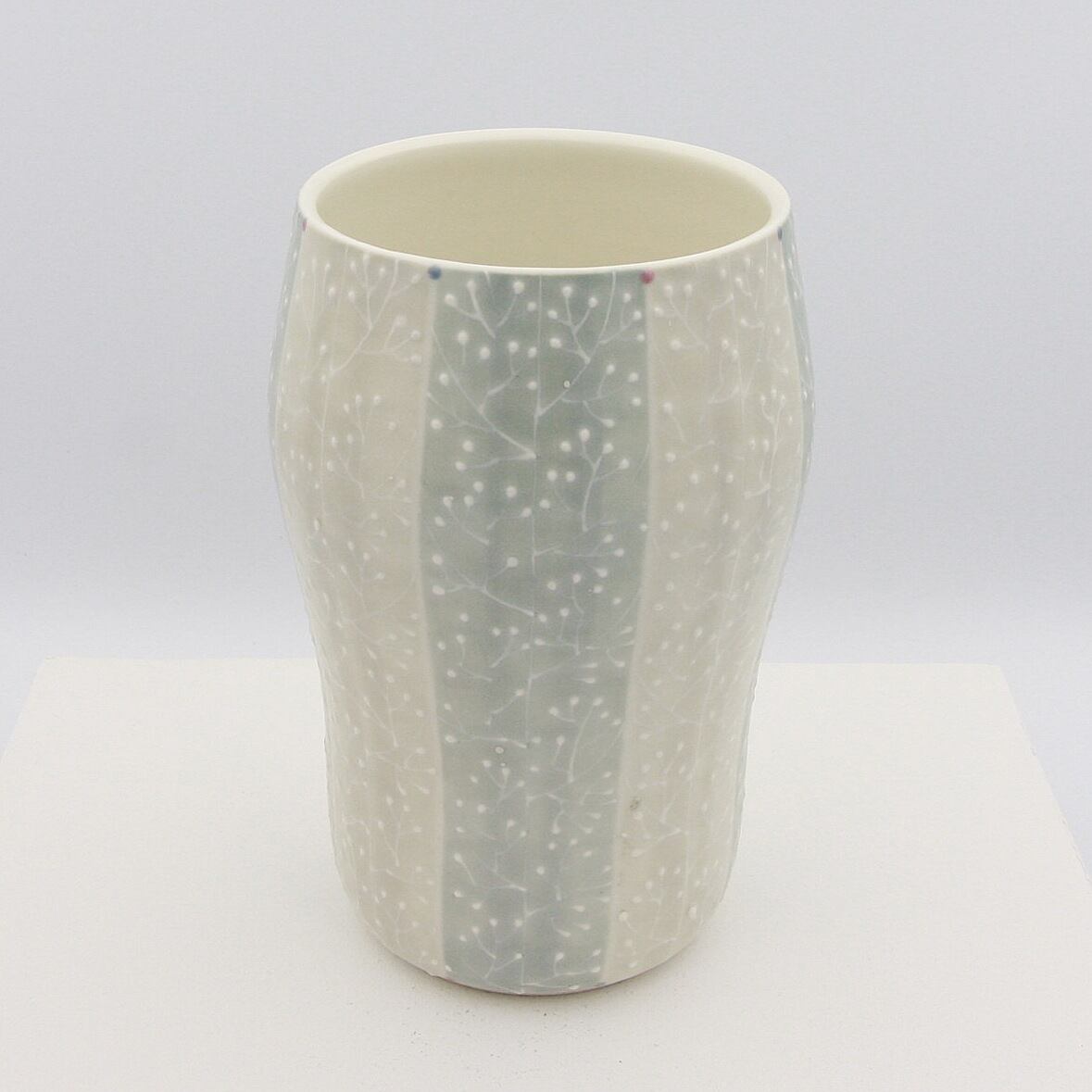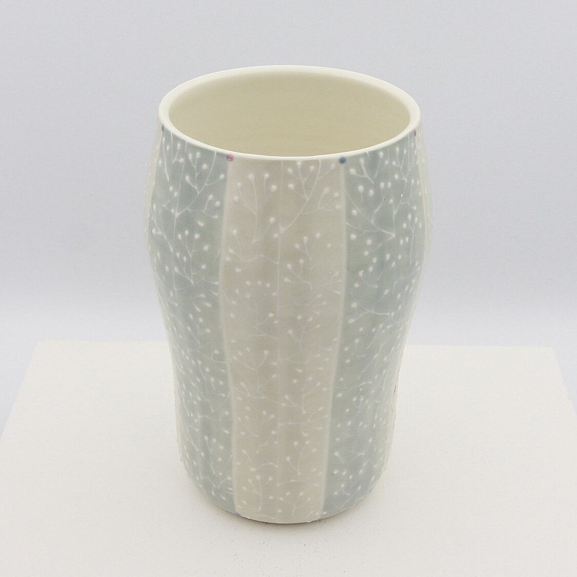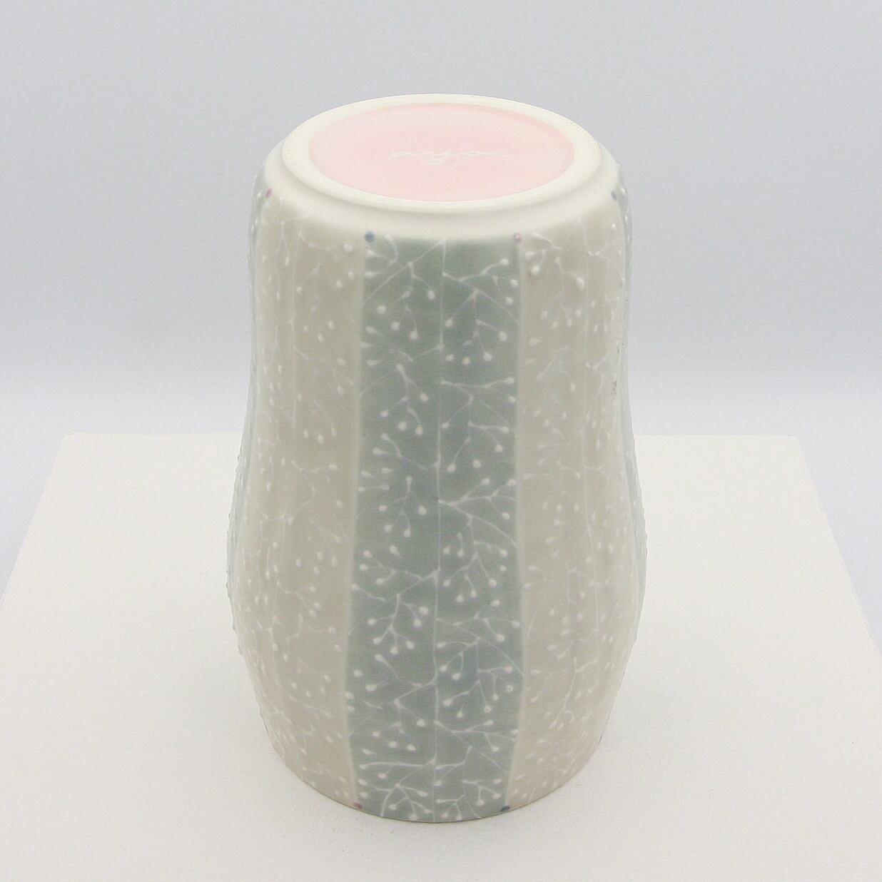 下絵具で全体に色付けし、イッチン(※)で木立の模様を描いています。本焼き後の上絵付けでピンクとブルーのドットを色付けしポイントにしています。生けた花が映えるよう色味を抑えたデザインとなっています。