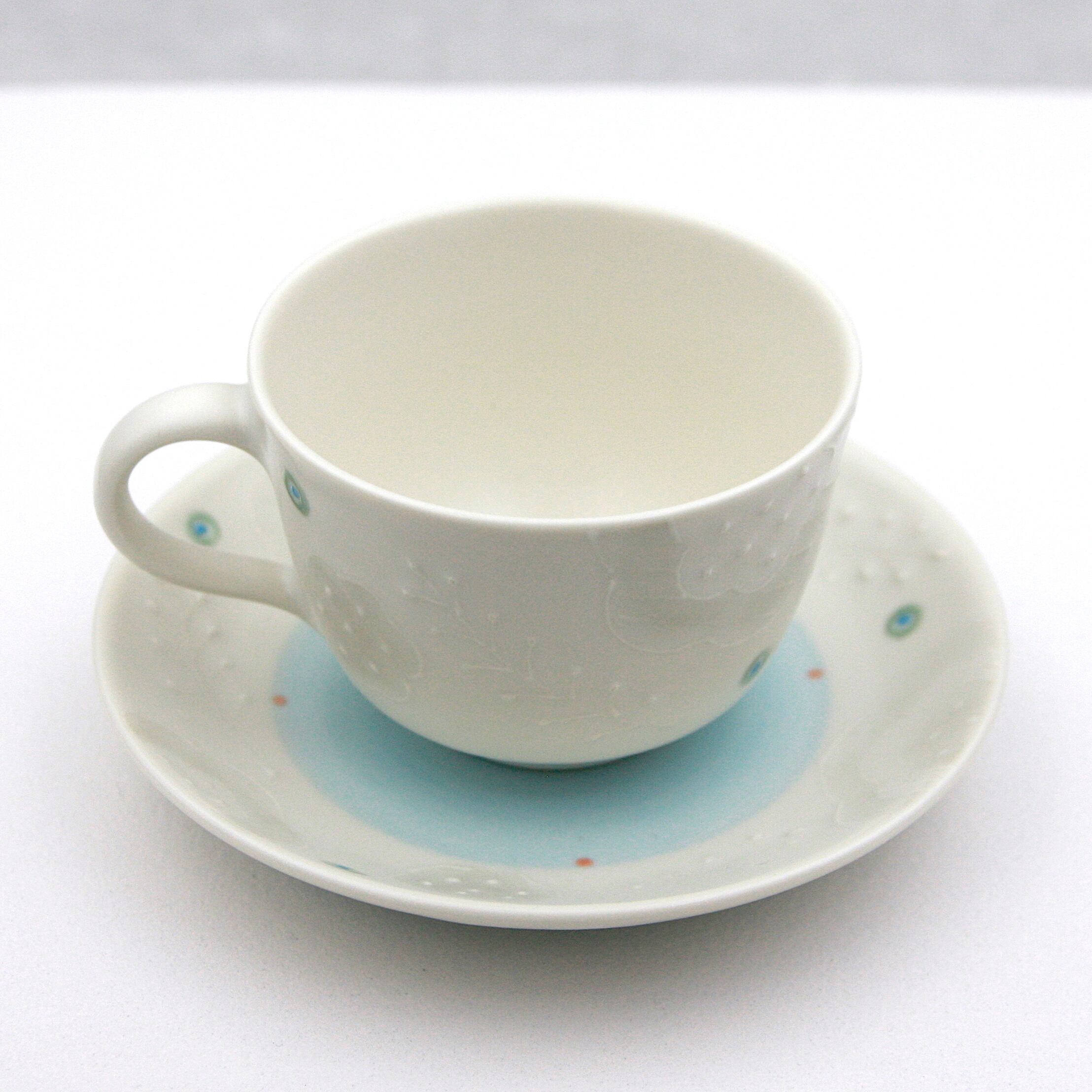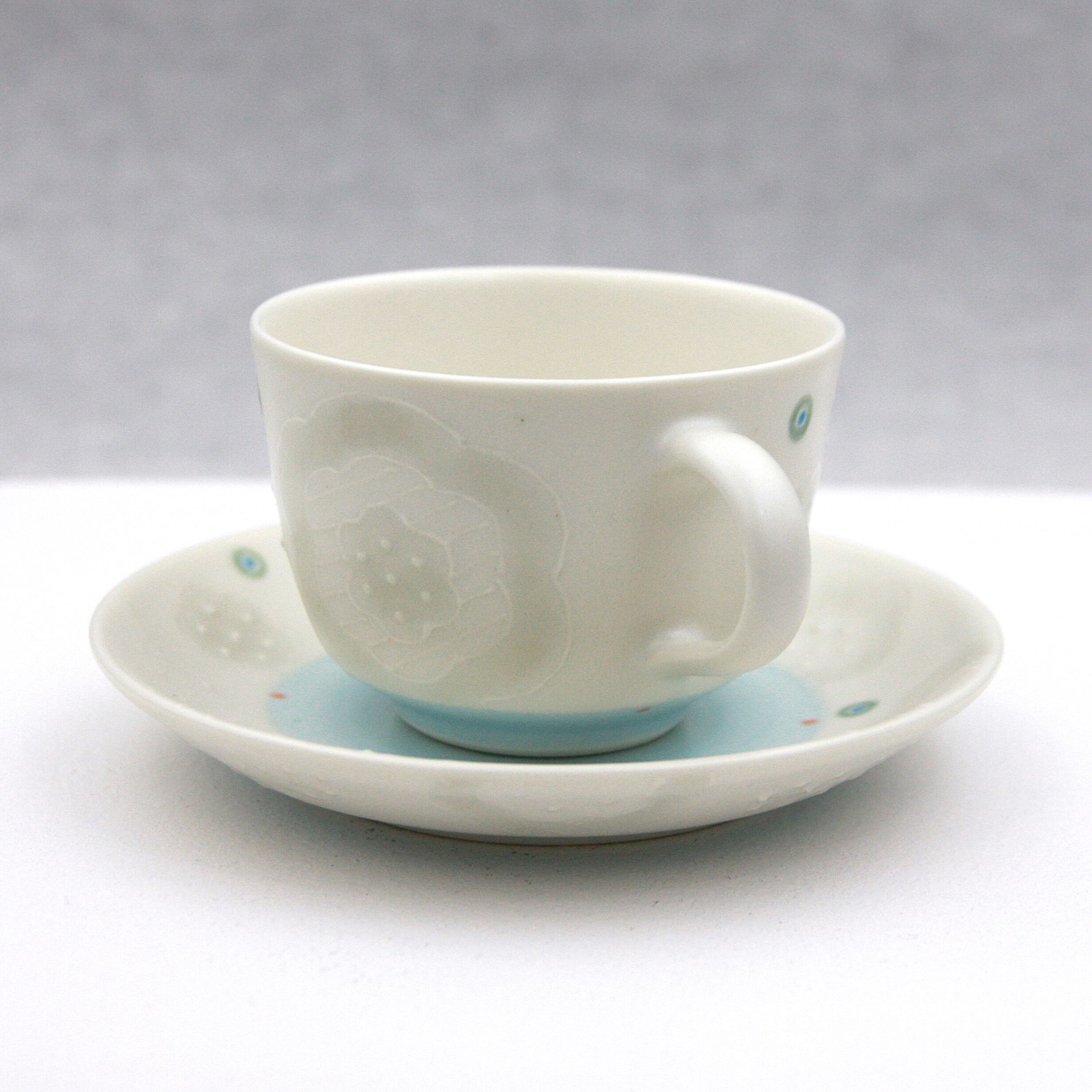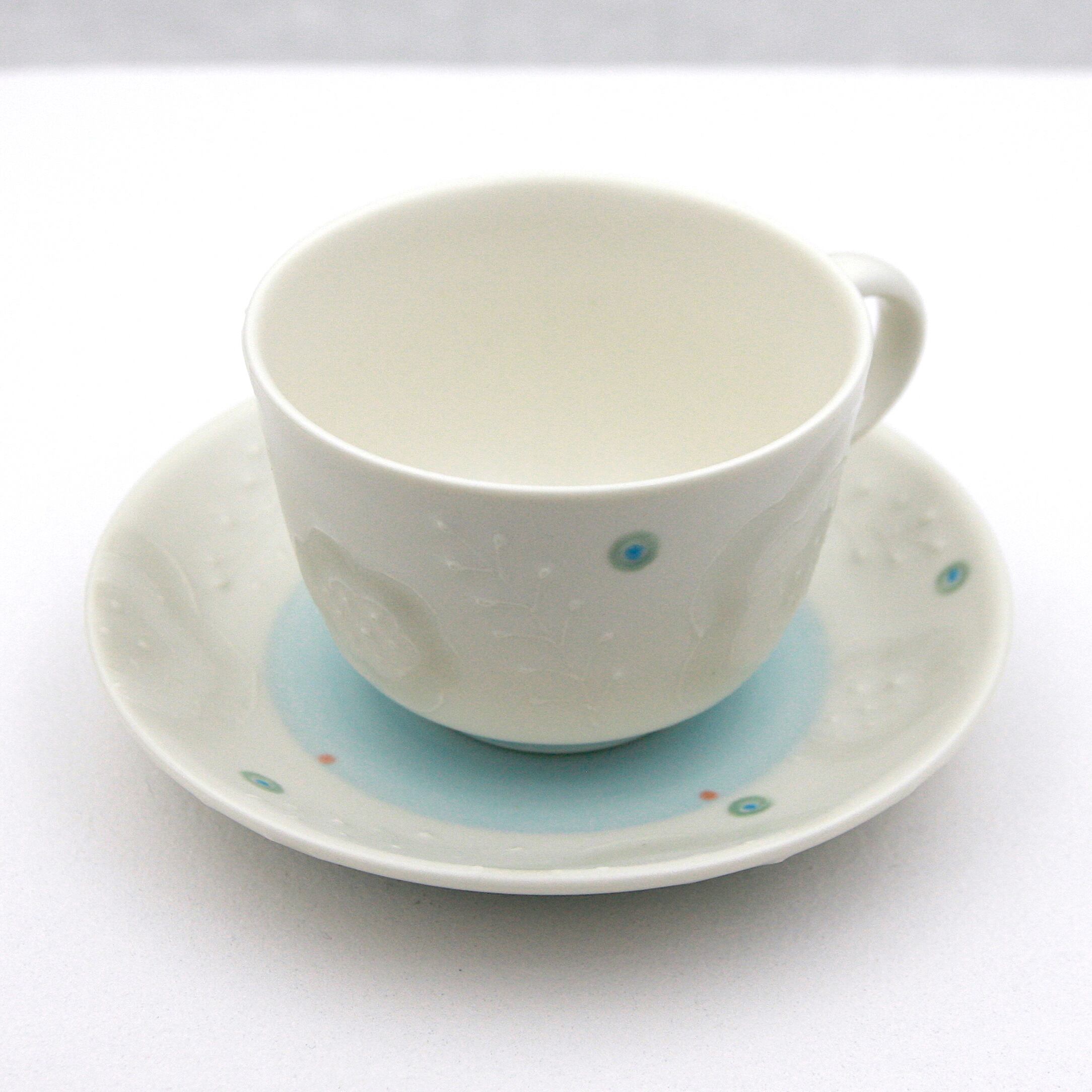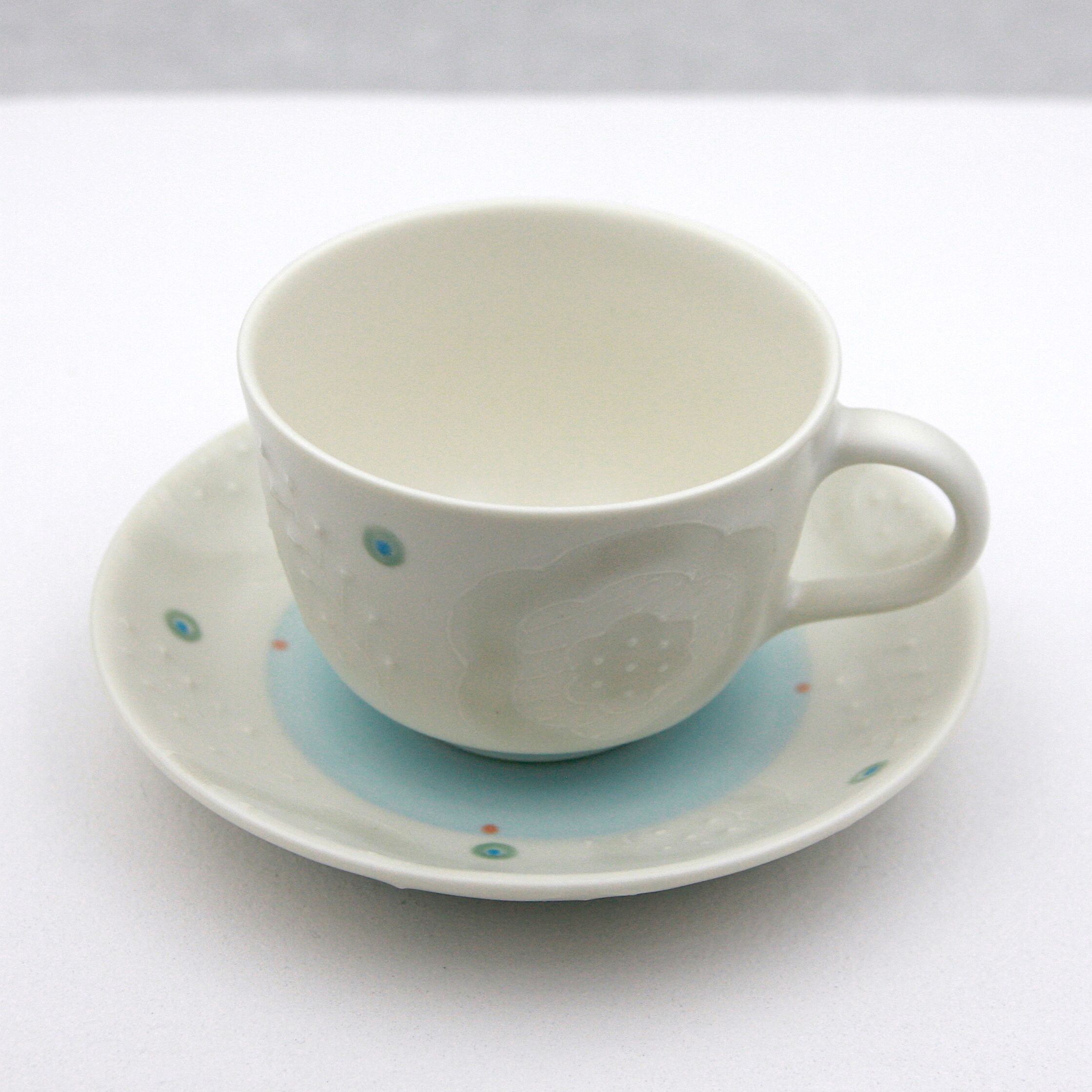 下絵付けで淡いグレーと水色を基調に彩色しています。花の模様ですが雪をイメージするような冬っぽさもあり、夏にも涼しげな色合いで季節を問わずお使いいただけます。時にはソーサーを小皿として、お菓子とともにティータイムを彩ります。