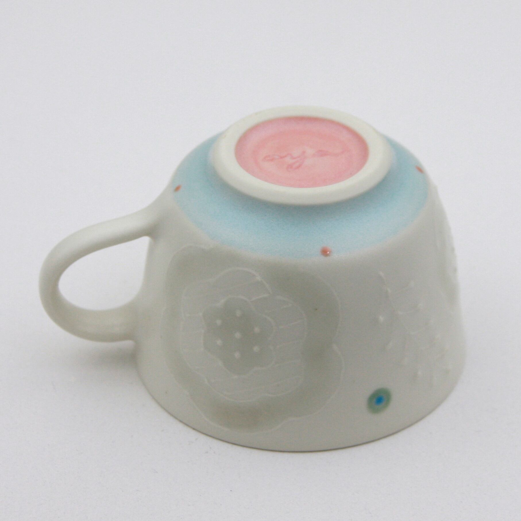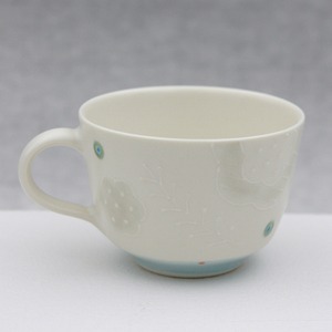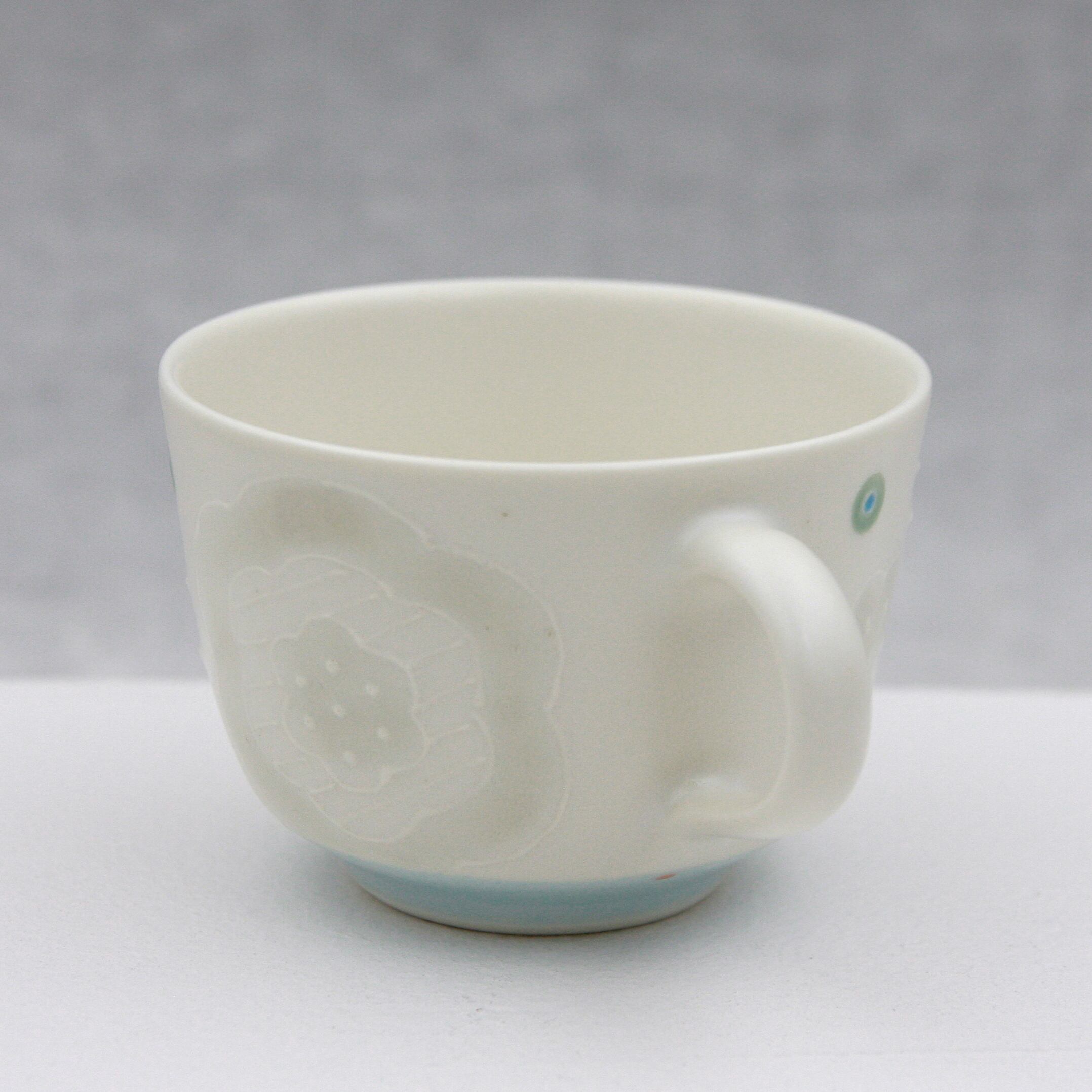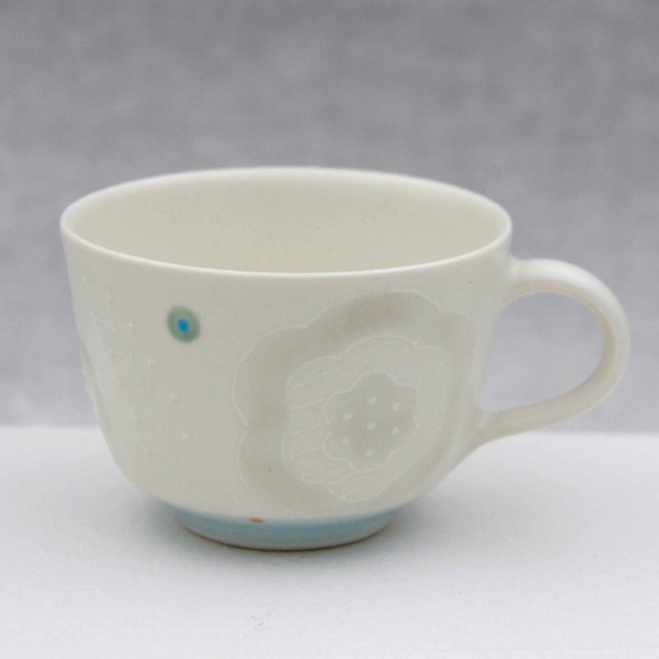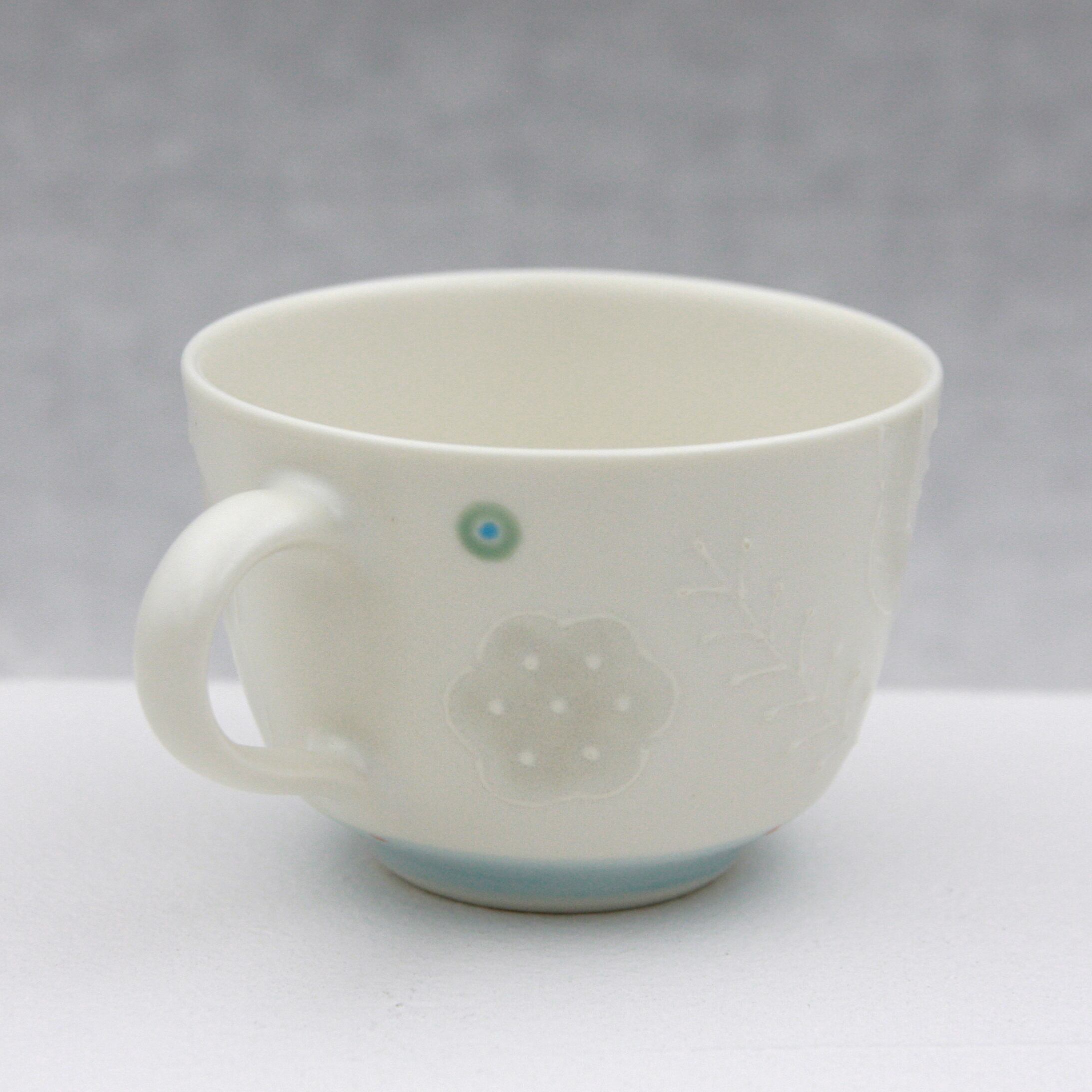 下絵付けで淡いグレーと水色を基調に彩色しています。花の模様ですが雪をイメージするような冬っぽさもあり、夏にも涼しげな色合いで季節を問わずお使いいただけます。時にはソーサーを小皿として、お菓子とともにティータイムを彩ります。