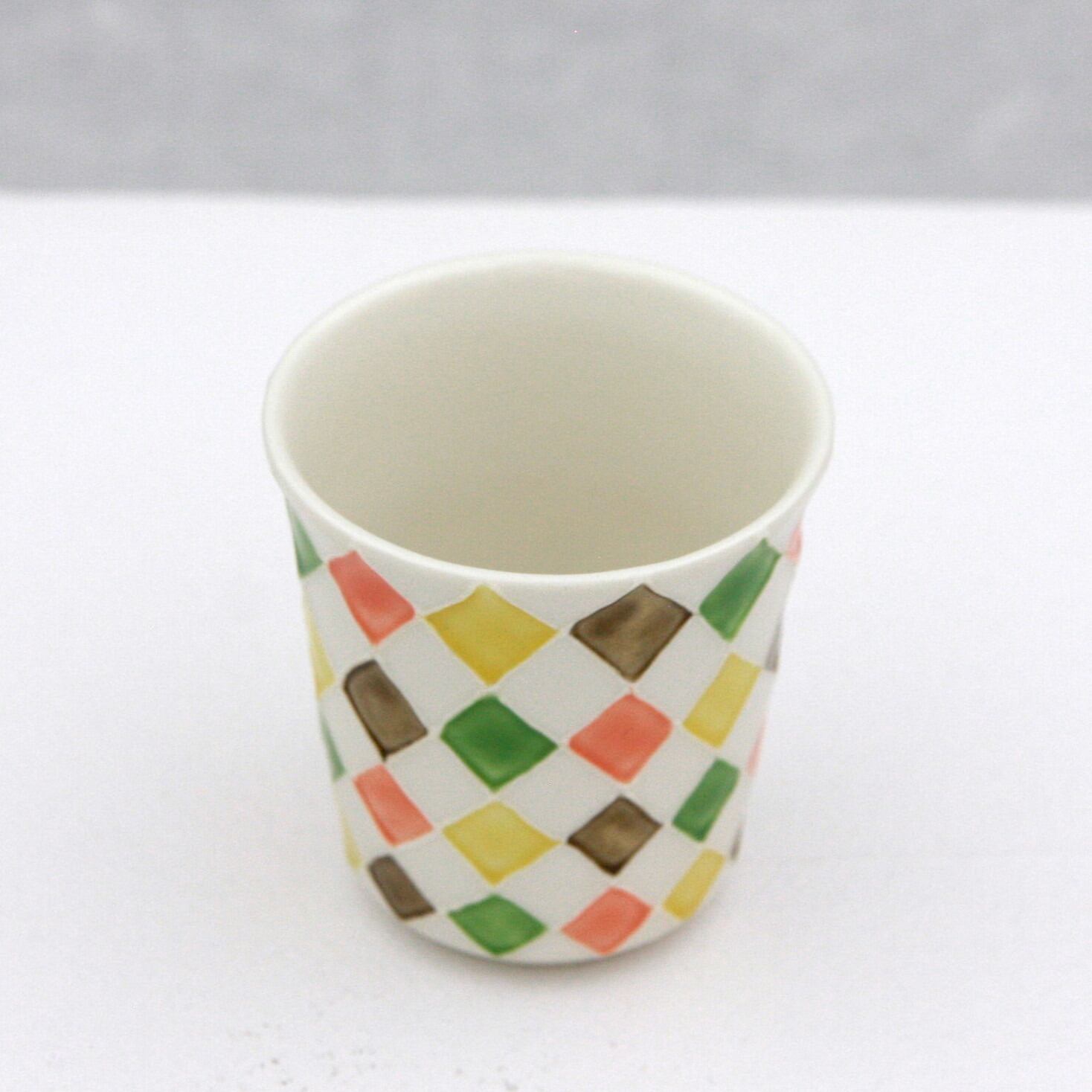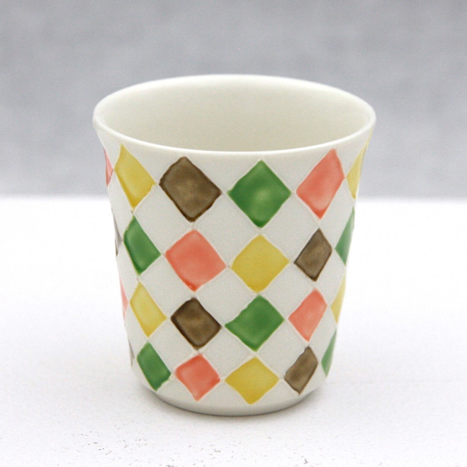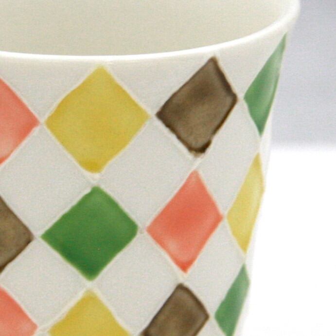 イッチン(※)で菱形を線描きし、白い釉薬と上絵付けの彩色による4色との市松模様になっています。お酒を呑むのが楽しくなるようなカラフルなデザインとなっております。