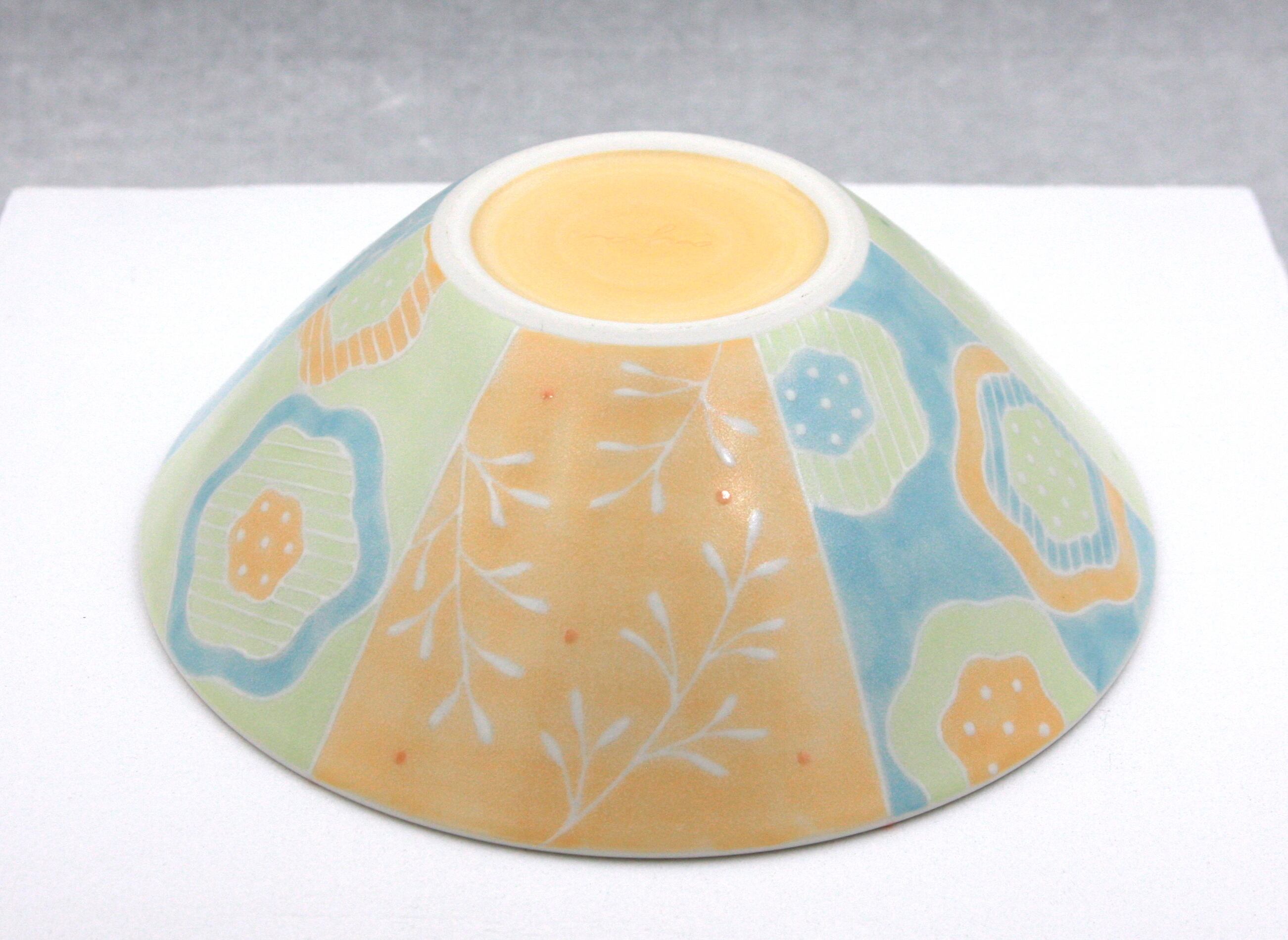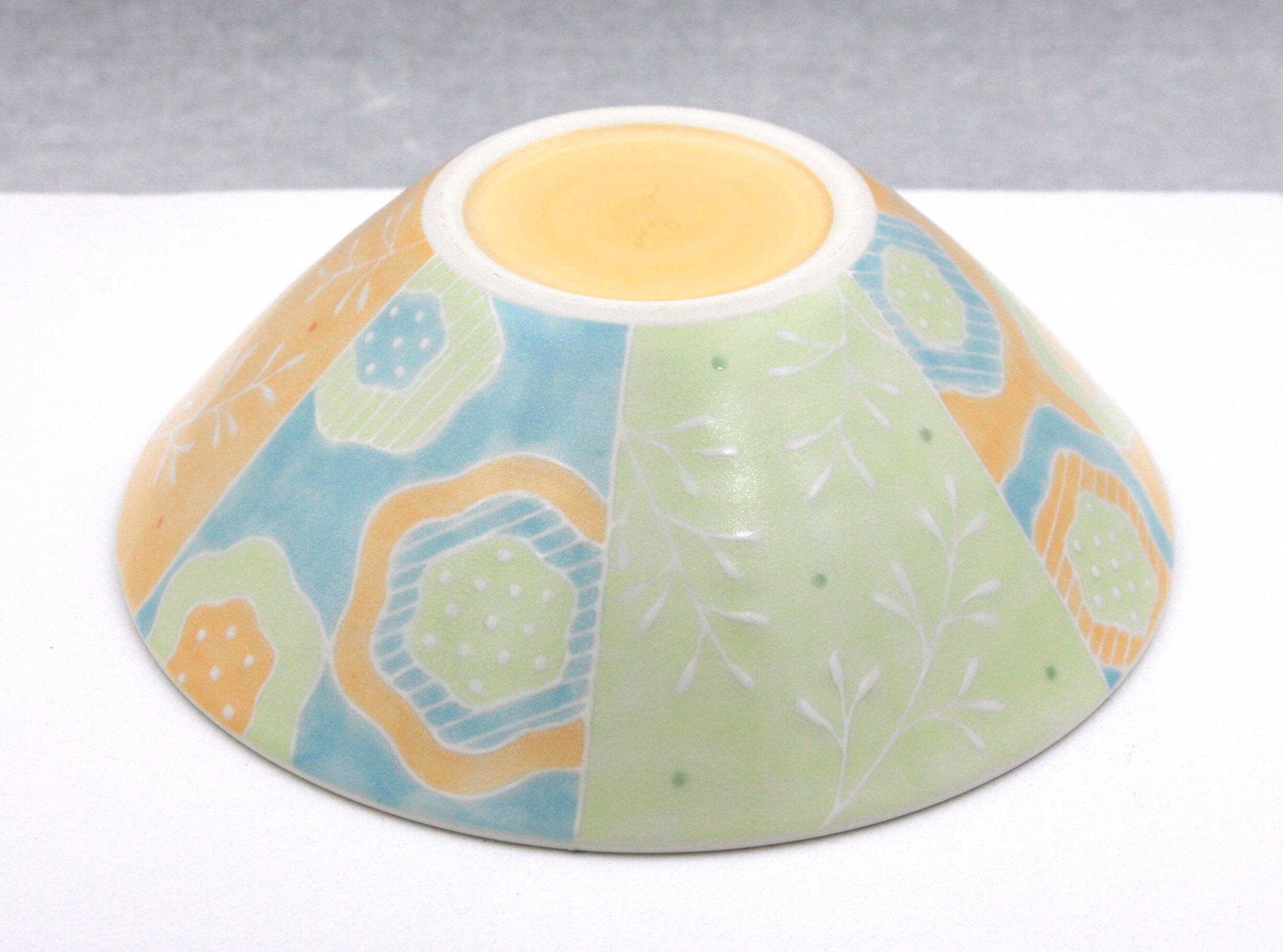 野菜サラダやフルーツの盛りつけに合う器をイメージしてデザインしたので「菜果鉢」と名づけました。盛りつけたものを邪魔しないよう内側はモノトーンに、外側は明るい色に彩色となっております。