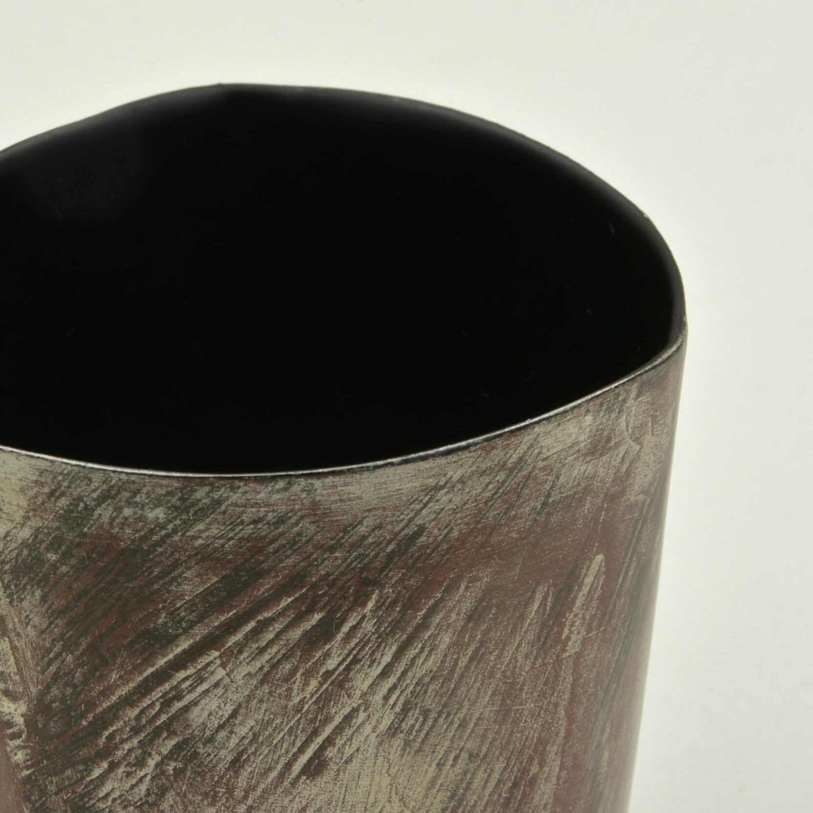 乾漆杯のシリーズで一番小さいぐいのみタイプです。乾漆の器は見た目はシャープなので硬い印象を受ける方が多いのですが、実際は口当たりが柔らかく暖かみがあります。冷酒はもちろん、熱燗を注いでも愉しめます。一般的なぐいのみと比較すると見た目の大きさはさほど変わりませんが容量は90㎖ほど入ります。外側は持った時に滑りにくい独自の質感です。幾層にも重ねて銀粉を蒔いて仕上げた模様は木目のようにも見えます。内側はシンプルにマットな黒漆で仕上げています。