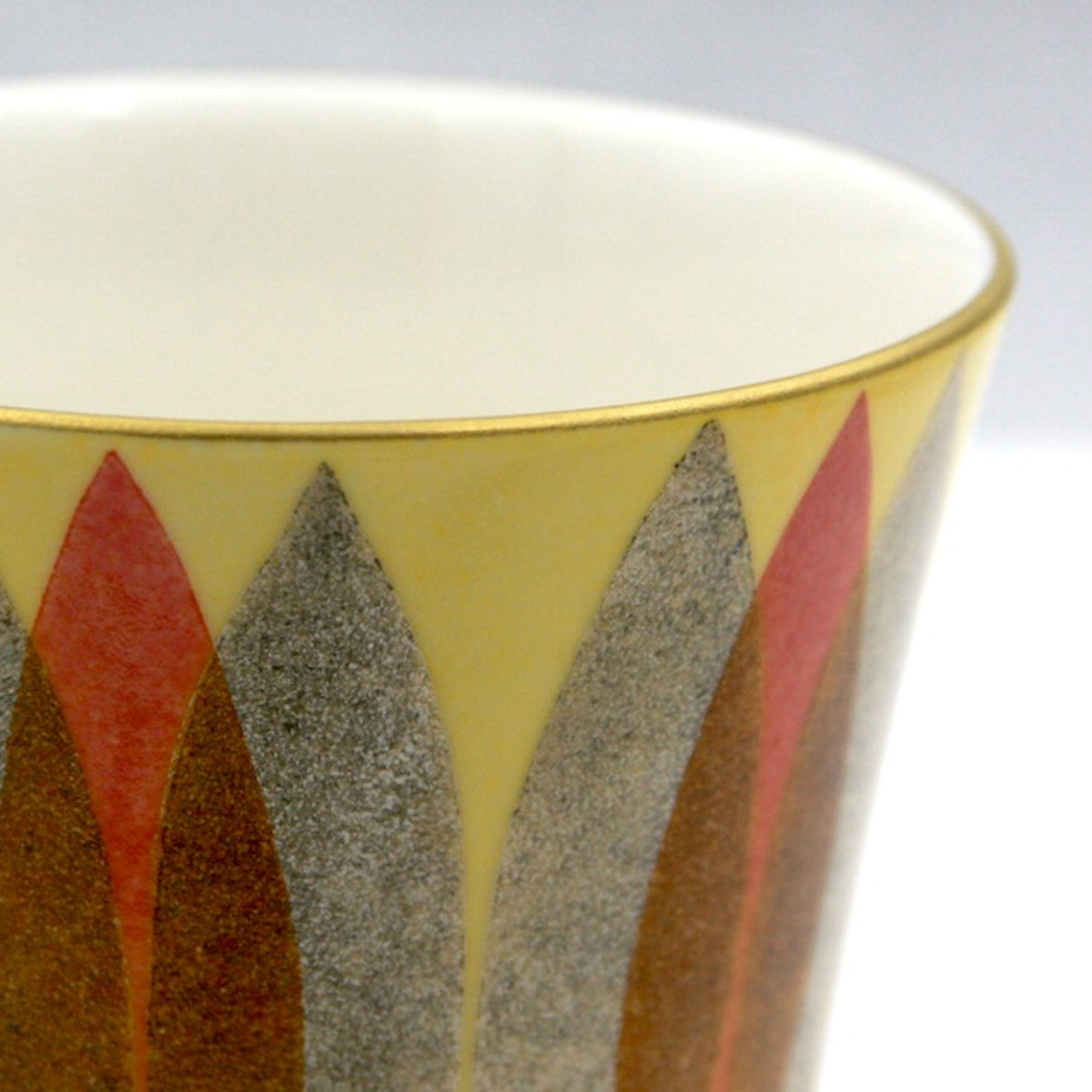 ロックやお湯割りなど焼酎を楽しむ器です。そば猪口や向付、湯呑など多岐にわたりお使いいただけます。桐箱付なので贈答品としても喜ばれます。模様は、色の数だけ何度も焼成することで表現されています。金銀彩を施し作品に重厚感を与えています。