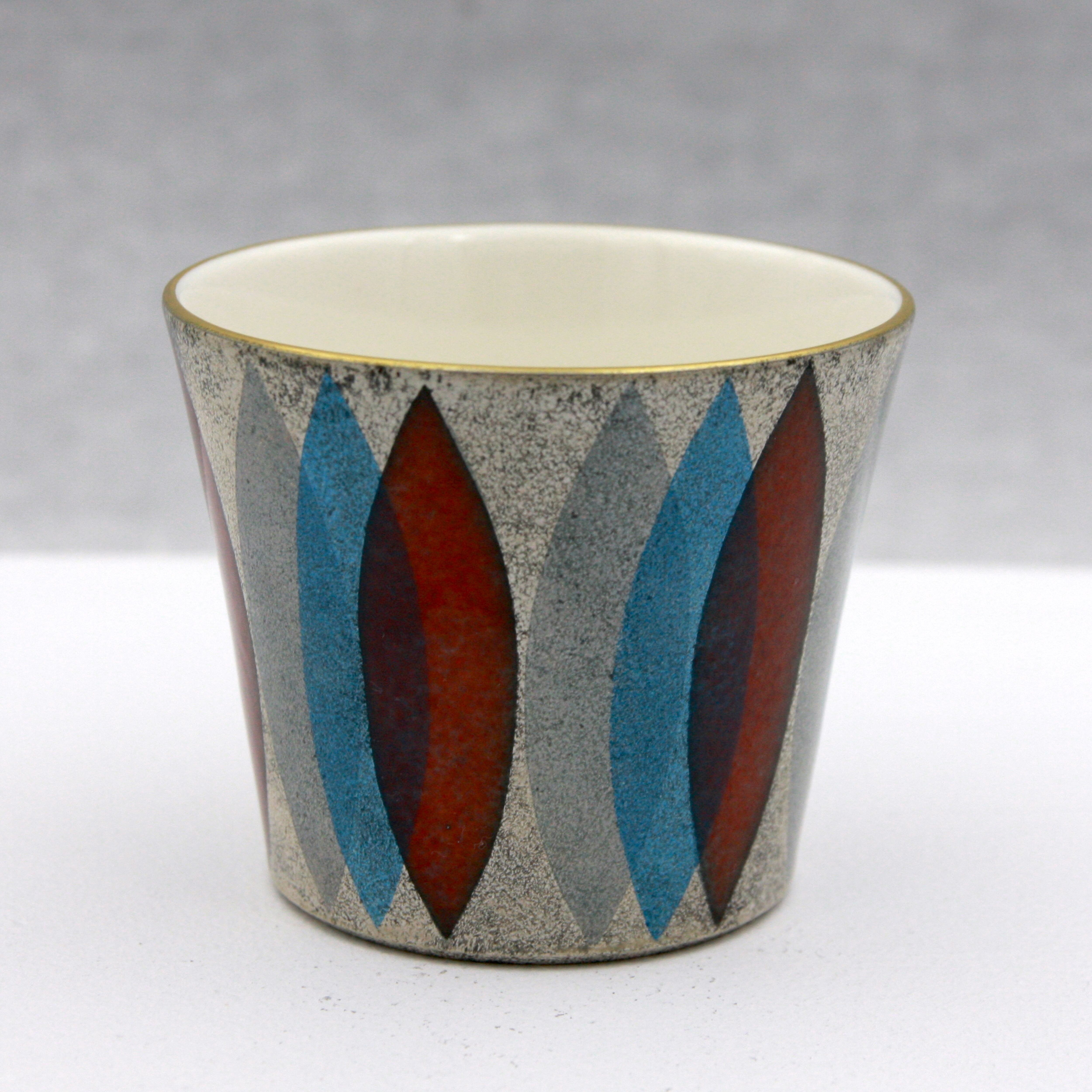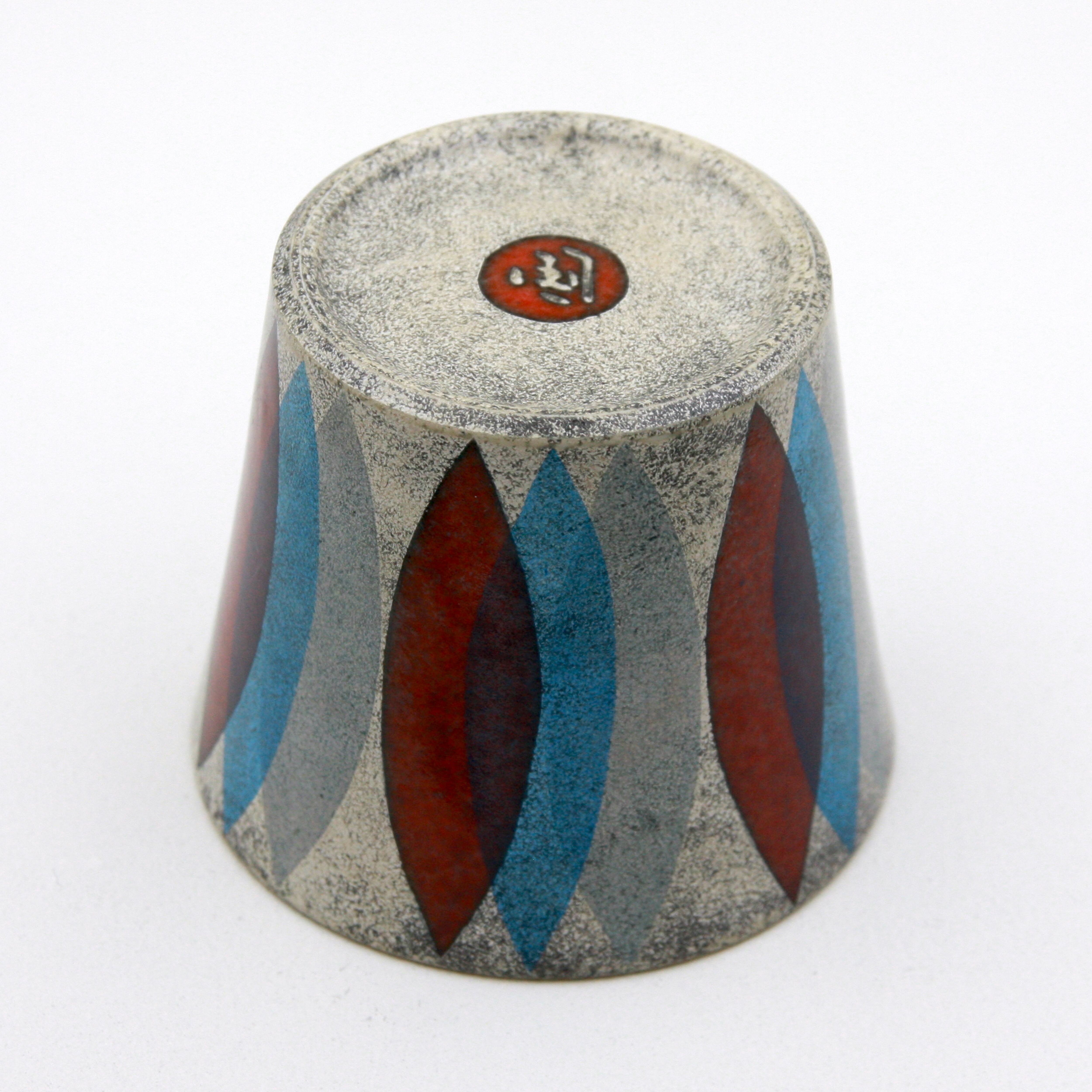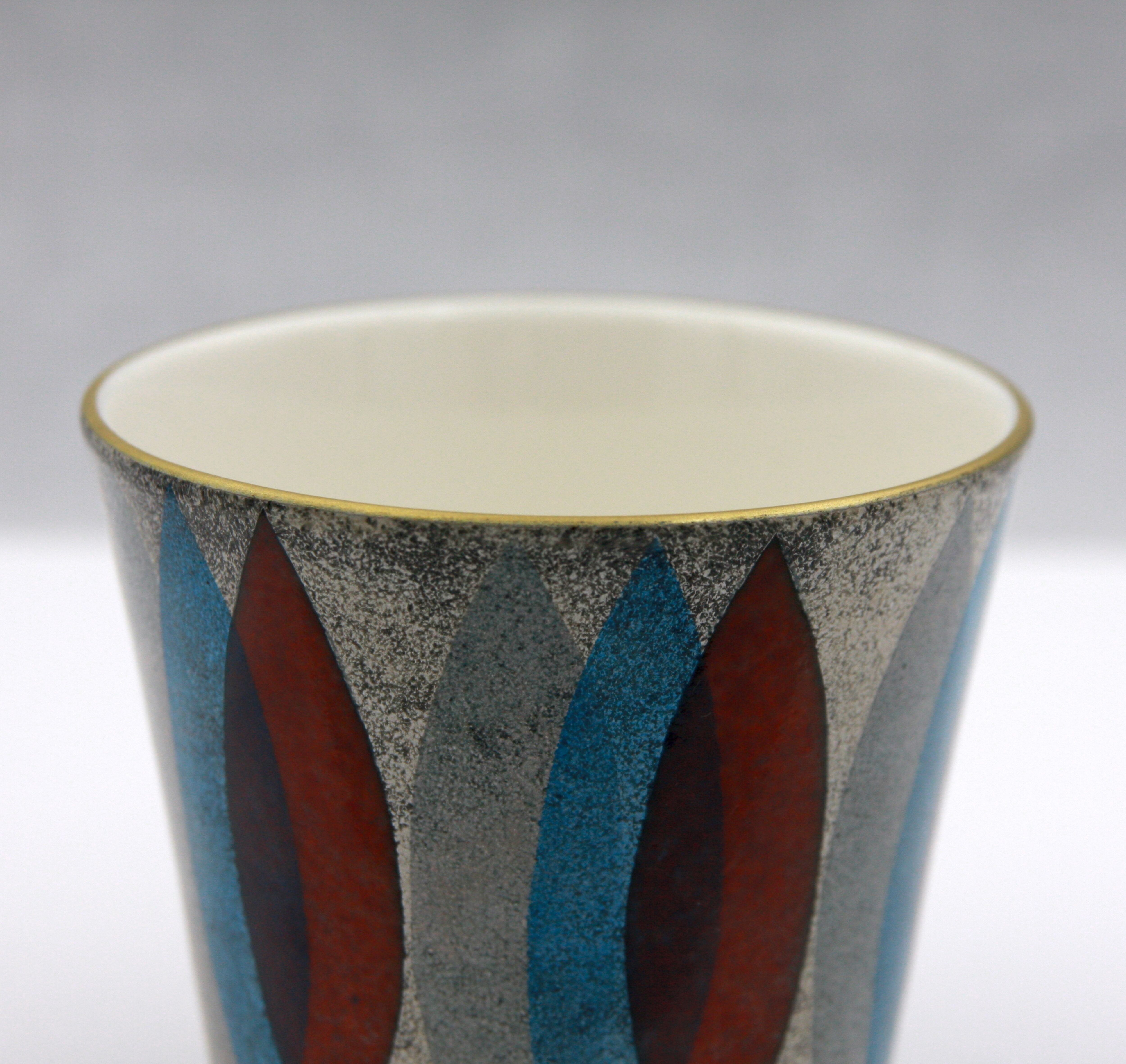 ロックやお湯割りなど焼酎を楽しむ器です。そば猪口や向付、湯呑など多岐にわたりお使いいただけます。桐箱付なので贈答品としても喜ばれます。模様は、色の数だけ何度も焼成することで表現されています。金銀彩を施し作品に重厚感を与えています。