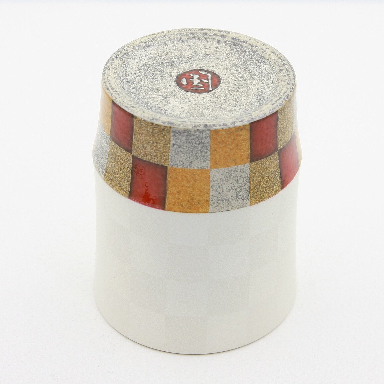 市松のデザインで統一感を出しながら、上部には白の表現を、下部には色を使いガラッと印象をを変え、形にも変化を持たしています。綺麗なお茶のグリーンが映えるお湯呑みです。