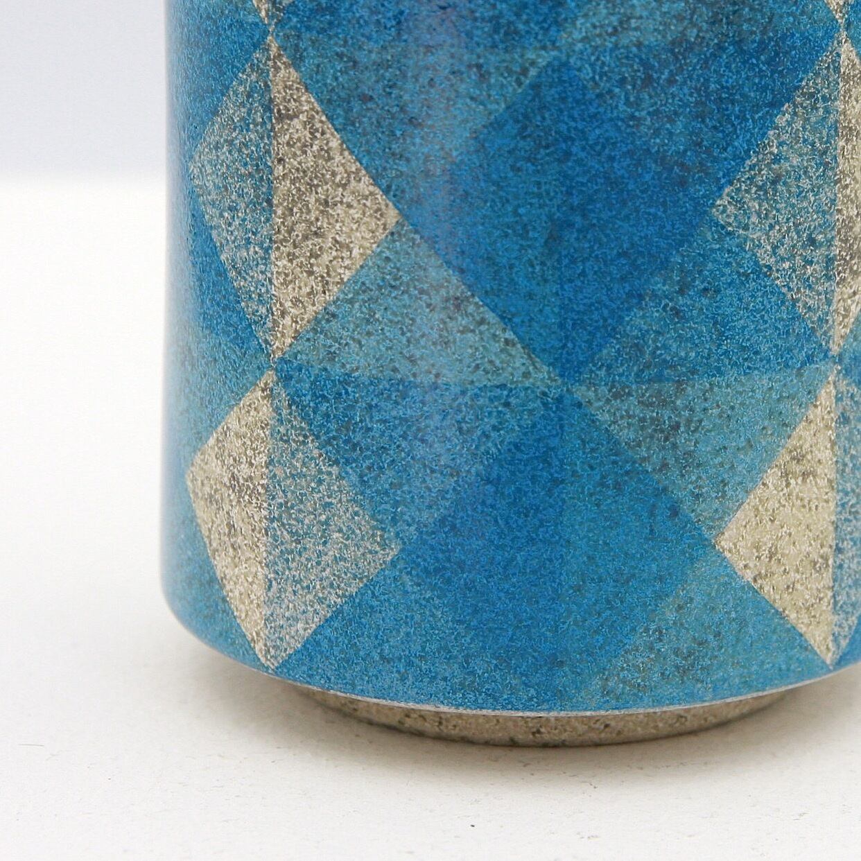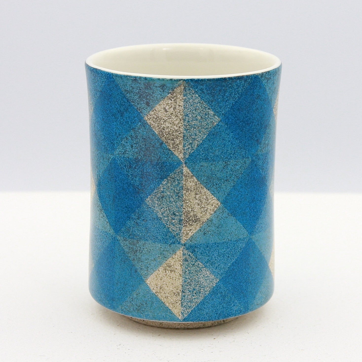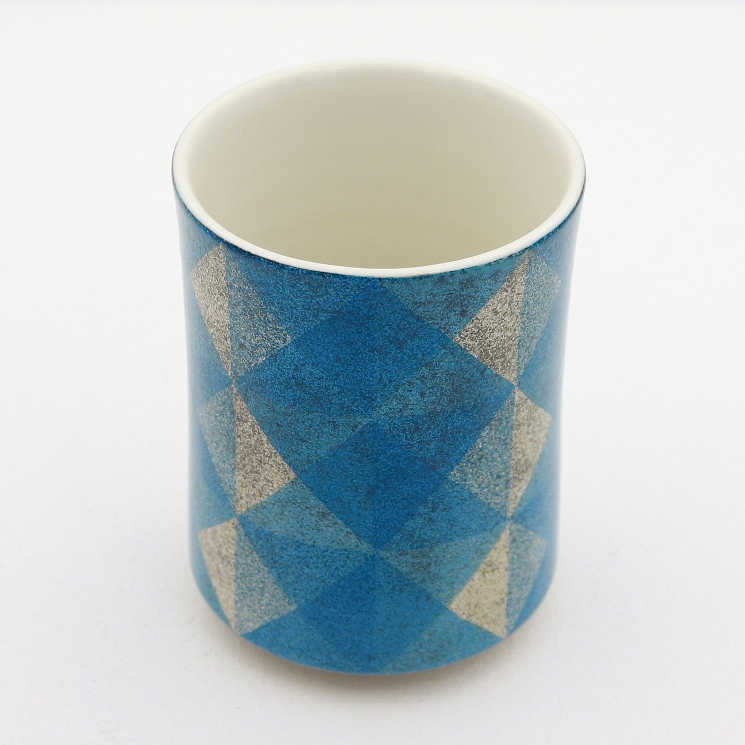 銀彩を施し青色を何回も重ねることで、複雑な模様ながら落ち着いた雰囲気に仕上がっています。切っ立ちで細身の形は、持ちやすく手になじみます。