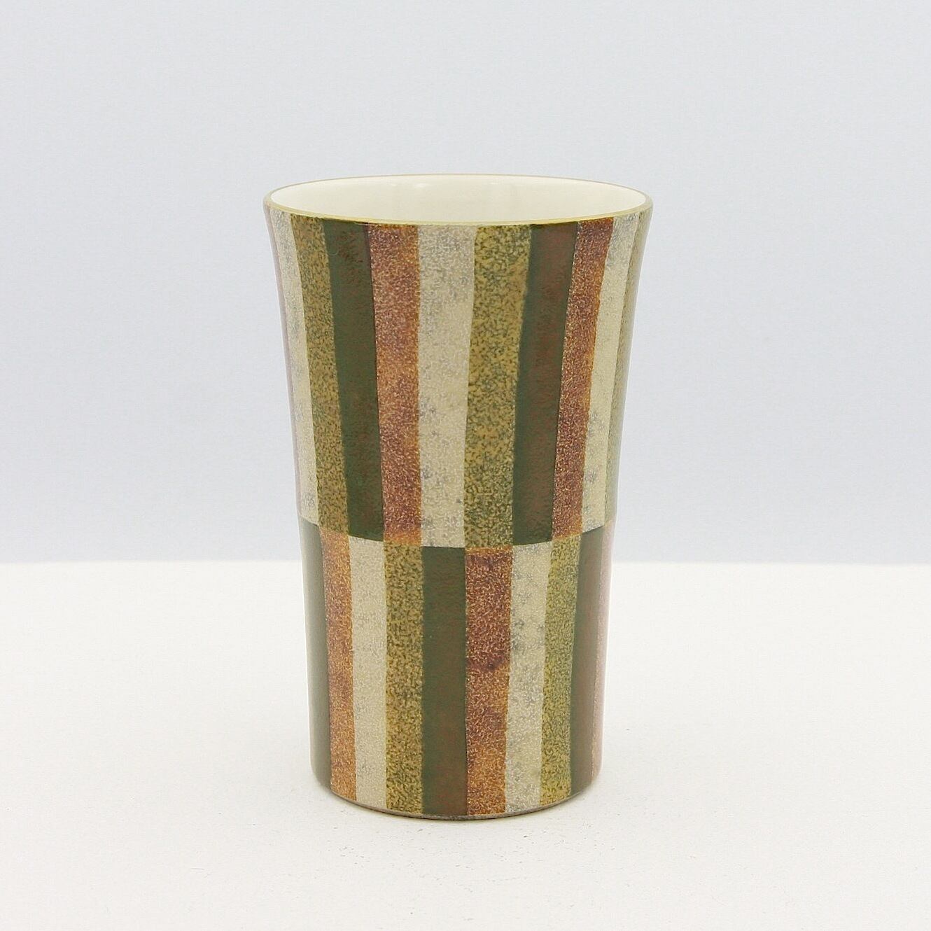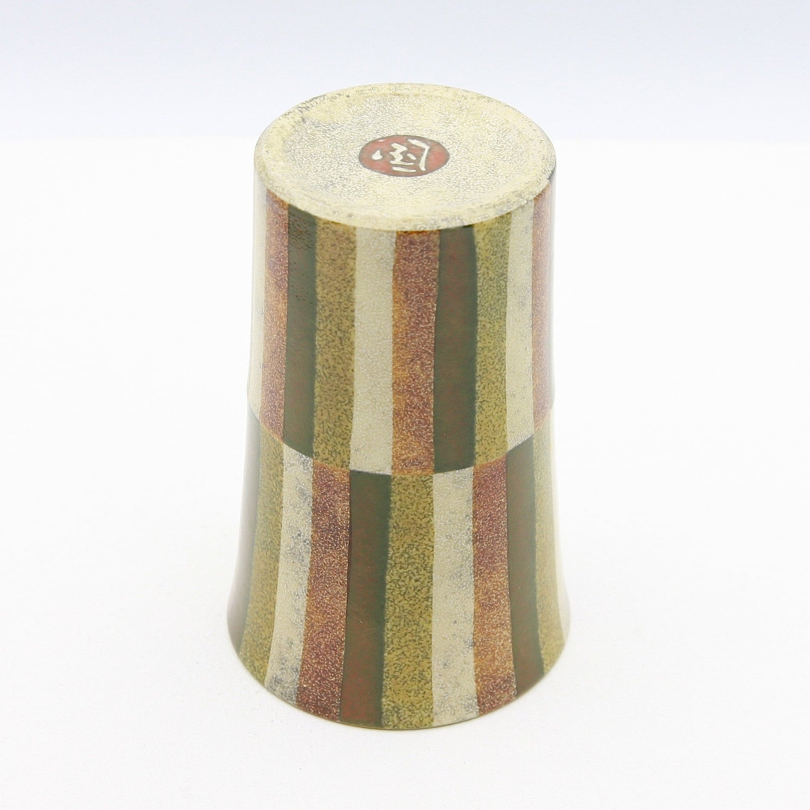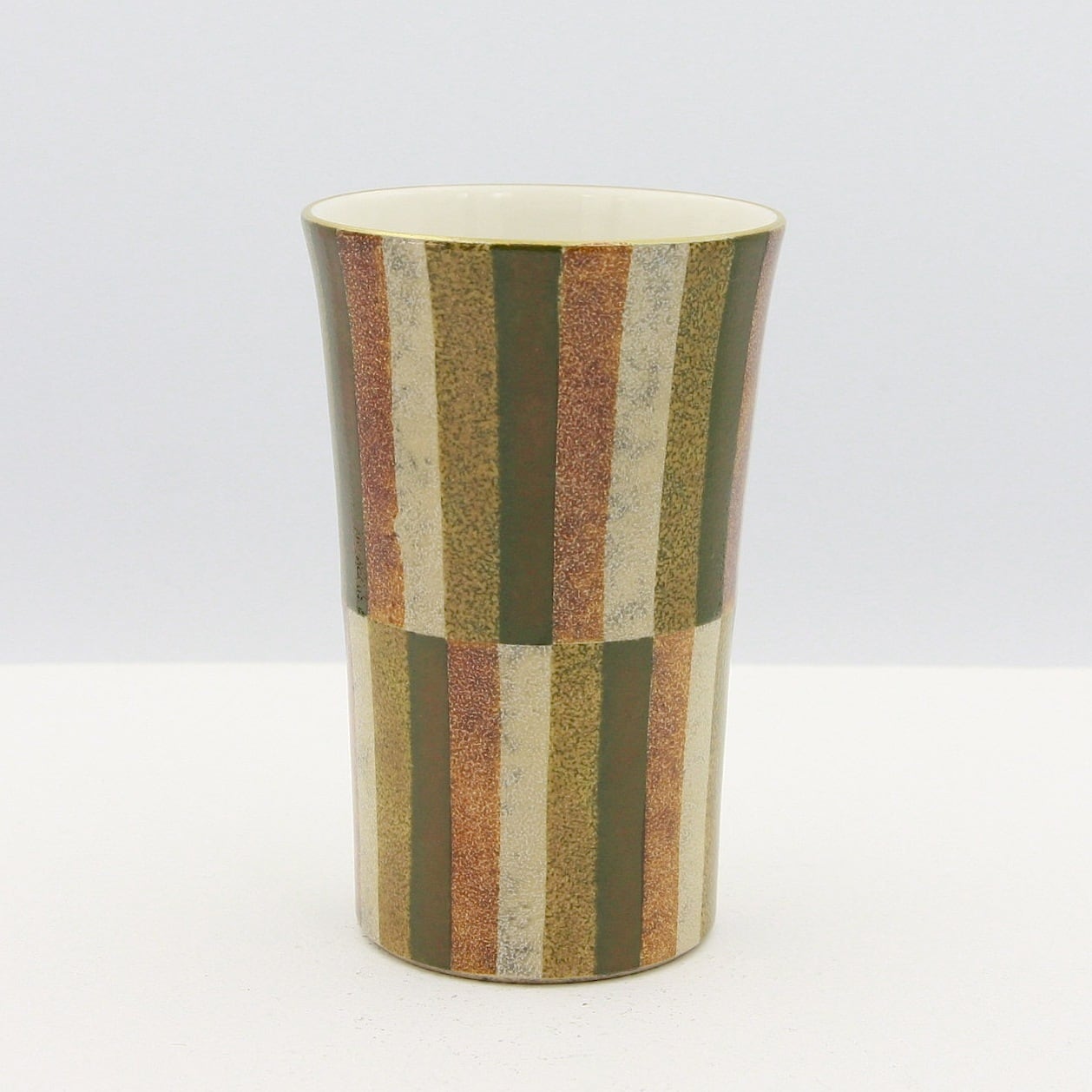 シンプルな筒形の中央部に節をつけることで、形や装飾に変化をもたせ、また、持ちやすいデザインになっています。口辺の金彩でキリッとした印象をもたせました。