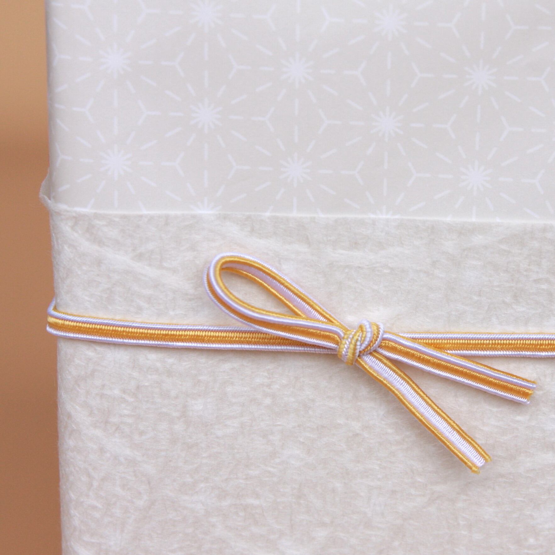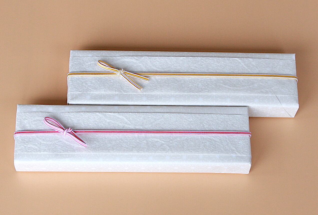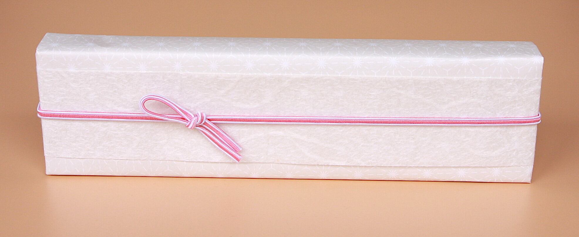 紙箱に贈り物を詰めて、さりげなく麻の葉が印字されている上質紙の上に、和紙をかけ、ふたえゴムを留めてお届けします。