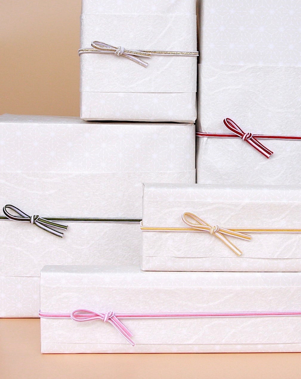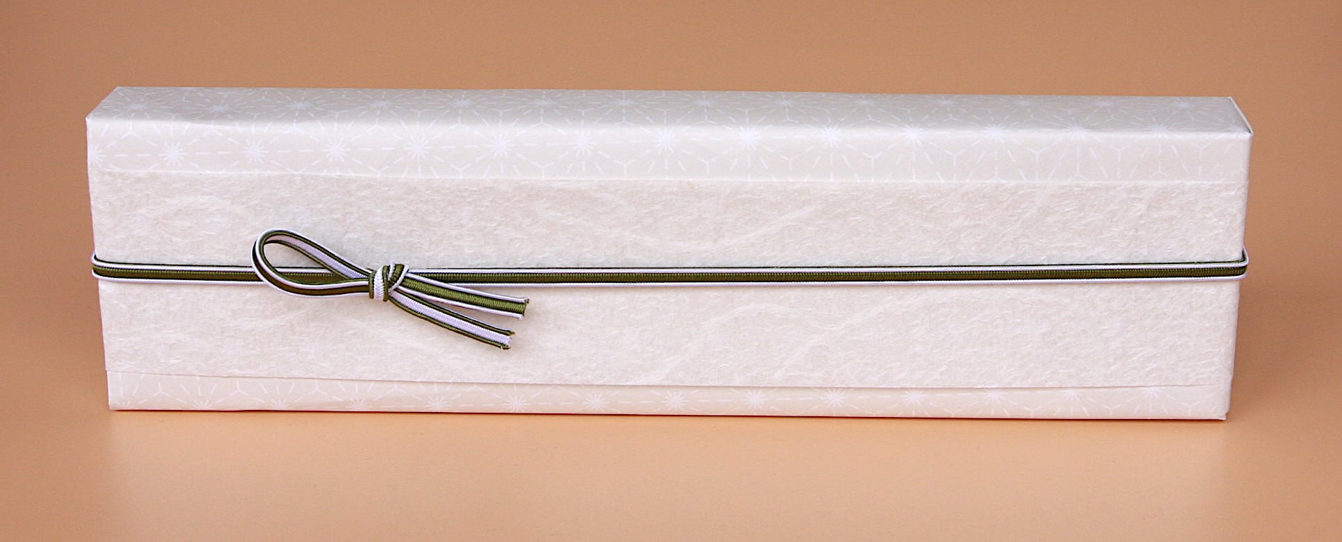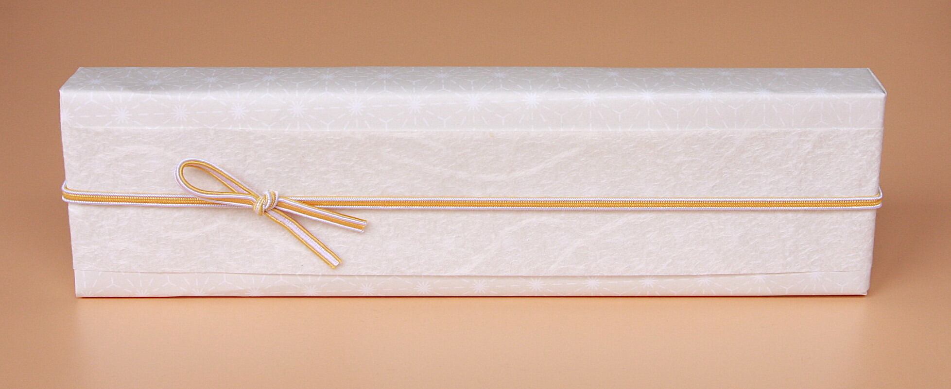 紙箱に贈り物を詰めて、さりげなく麻の葉が印字されている上質紙の上に、和紙をかけ、ふたえゴムを留めてお届けします。