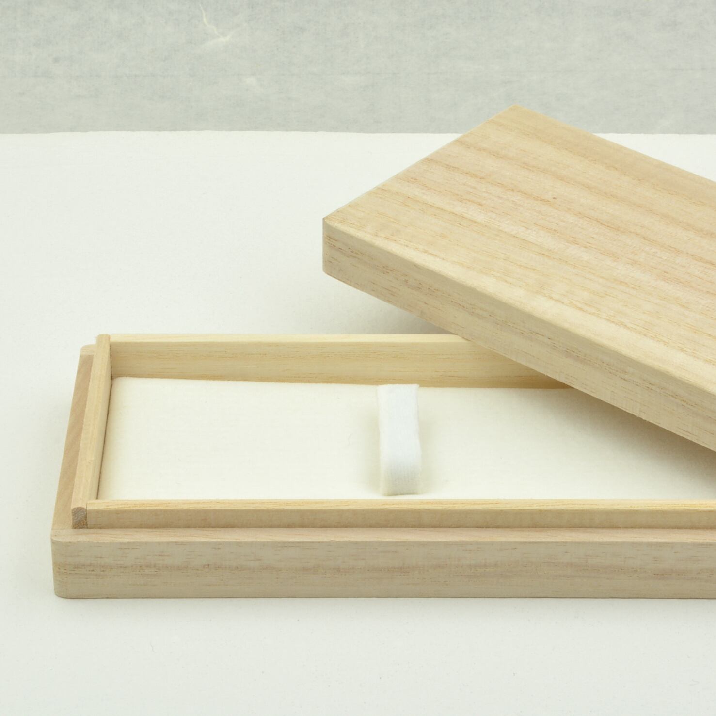 箸専用桐箱に詰めて、さりげなく麻の葉が印字されている上質紙の上に、和紙をかけ、ふたえゴムを留めてお届けします。