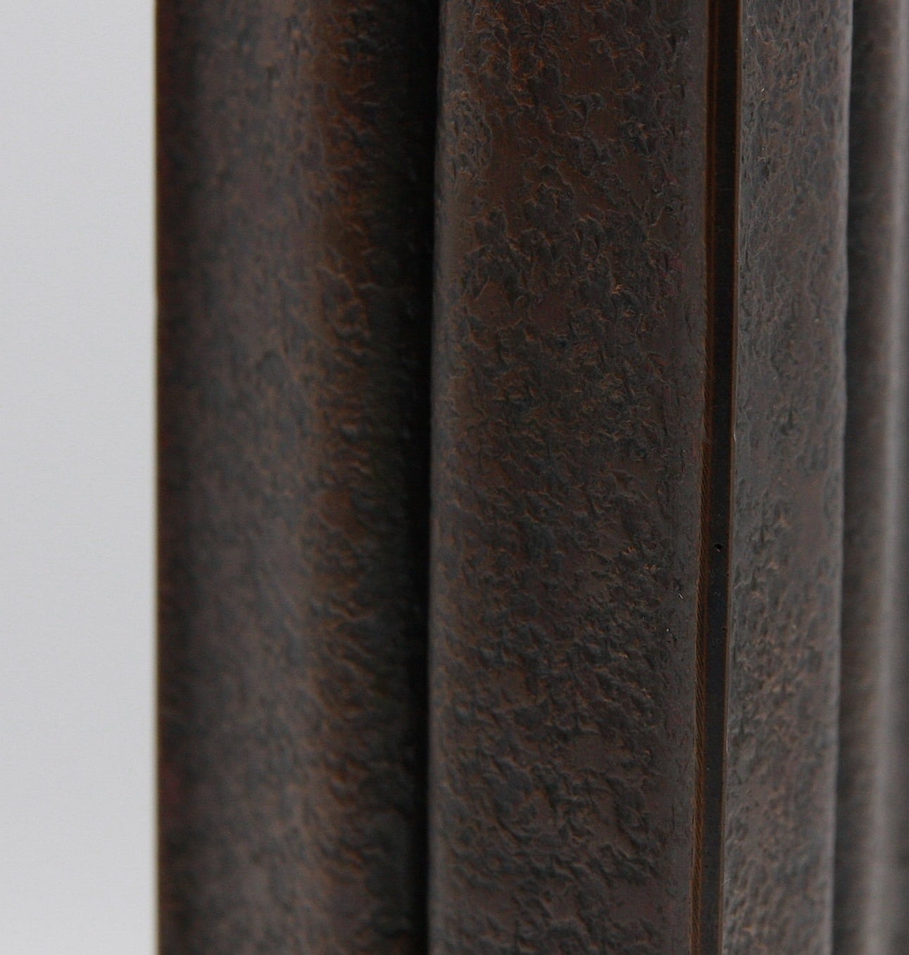 この銅製花器の仕上げは硫化蜜蝋仕上げです。この仕上げは天然のものですので、塗装のような強度はありません。水を入れている内側には緑青(酸化)が発生しますが、人体に影響はありません。表面に水が付いた場合はすぐに拭き取って頂ければ、酸化は防げます。