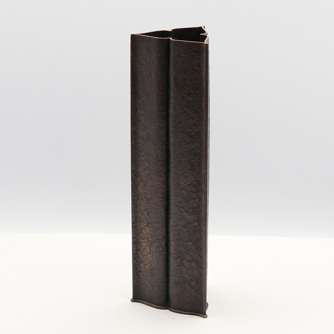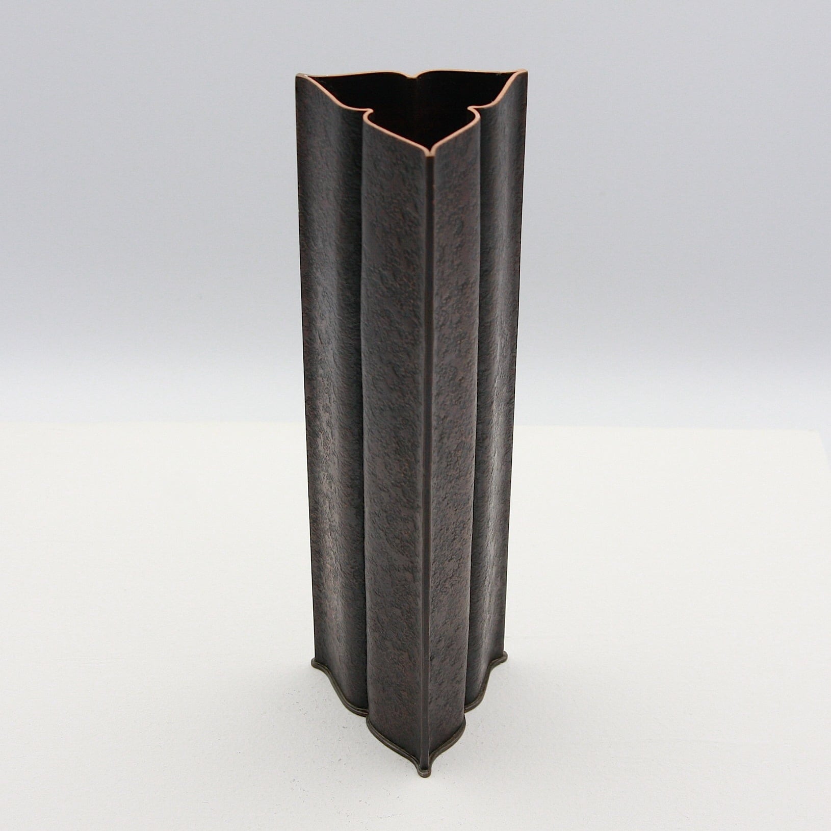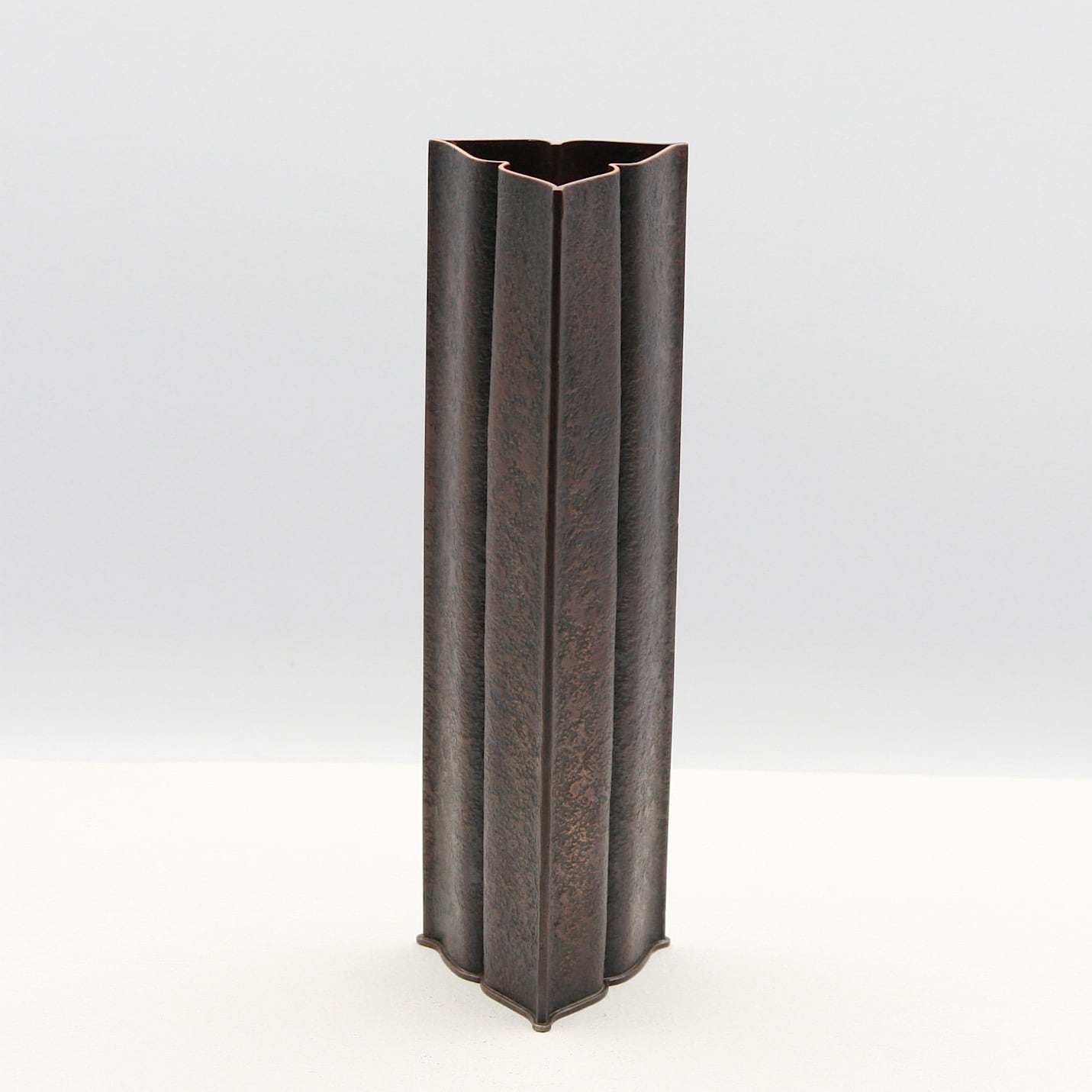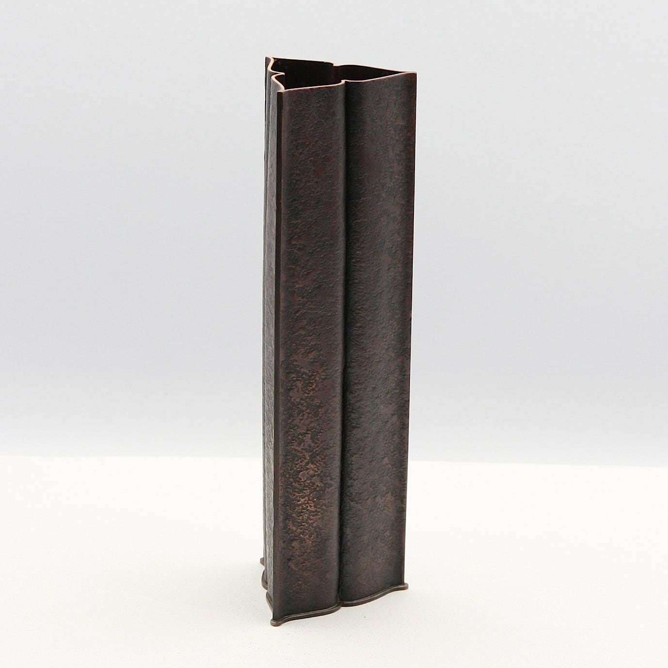 そびえ立つような姿の銅の花器シリーズ。銅板を金槌で丁寧に叩いて表面の模様を作っています。一輪挿しは切り口の形が美しく、オブジェとしても飾って頂けます。仕上げは硫化仕上げの後、蜜蝋を施し、自然な風合いを出しています。