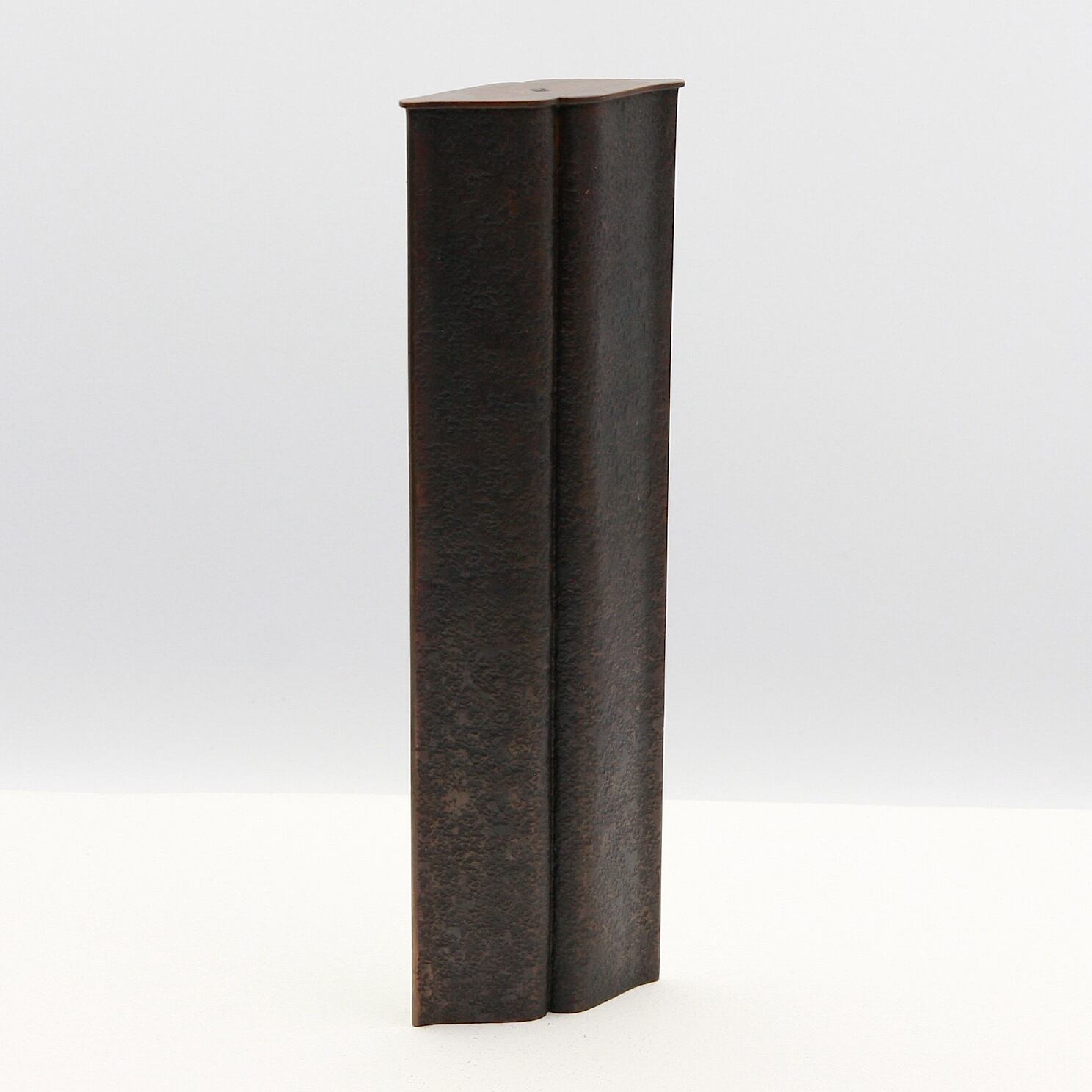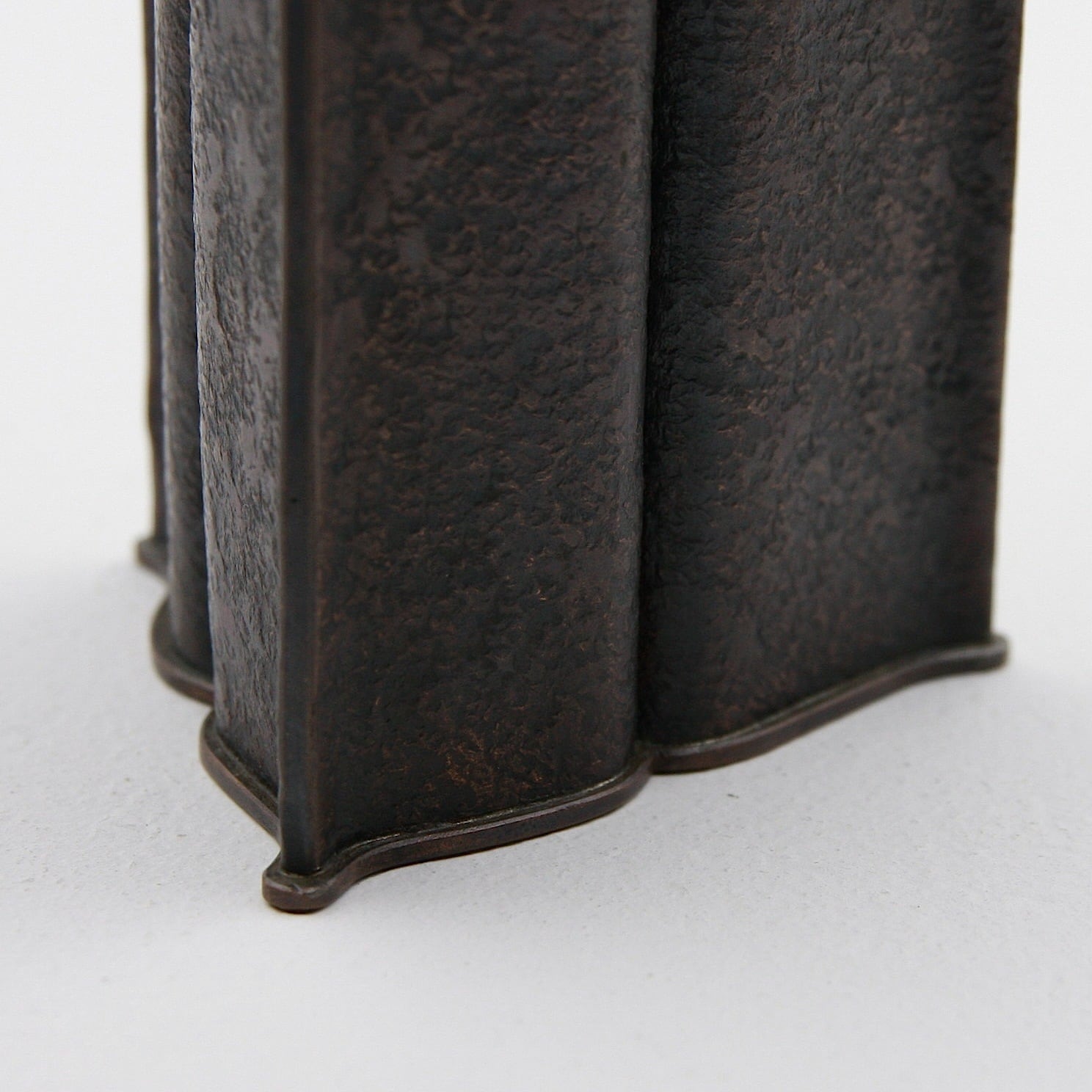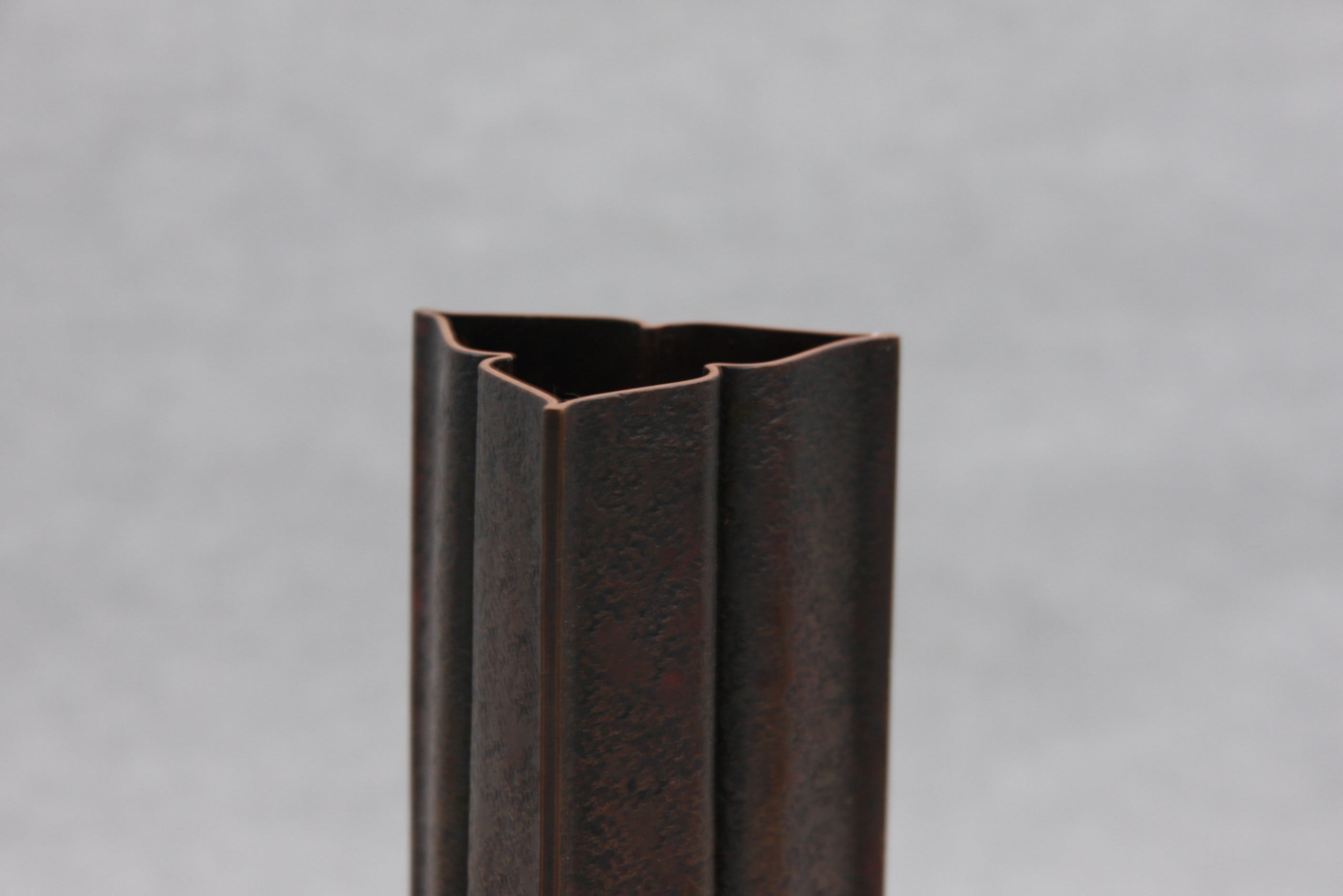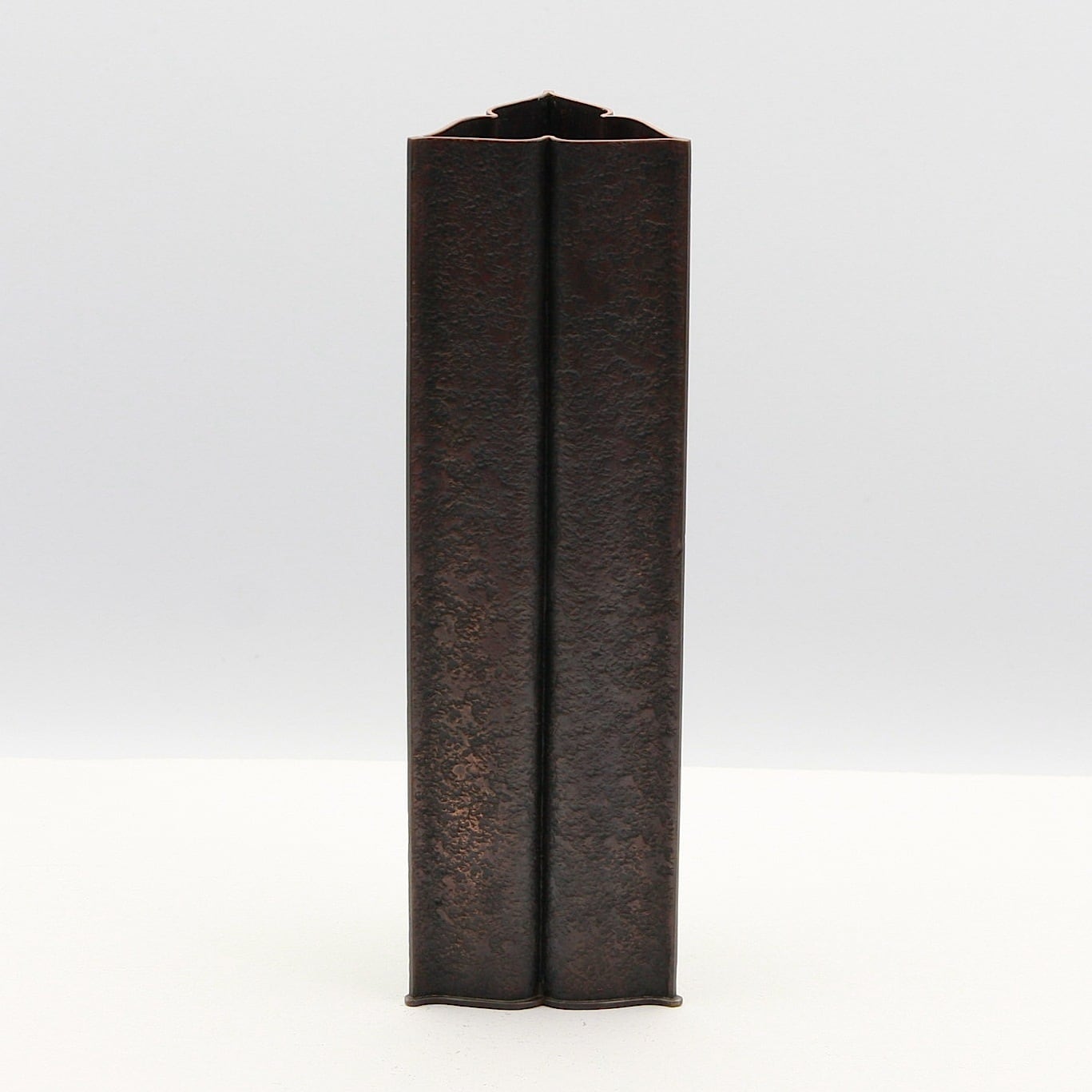 そびえ立つような姿の銅の花器シリーズ。銅板を金槌で丁寧に叩いて表面の模様を作っています。一輪挿しは切り口の形が美しく、オブジェとしても飾って頂けます。仕上げは硫化仕上げの後、蜜蝋を施し、自然な風合いを出しています。