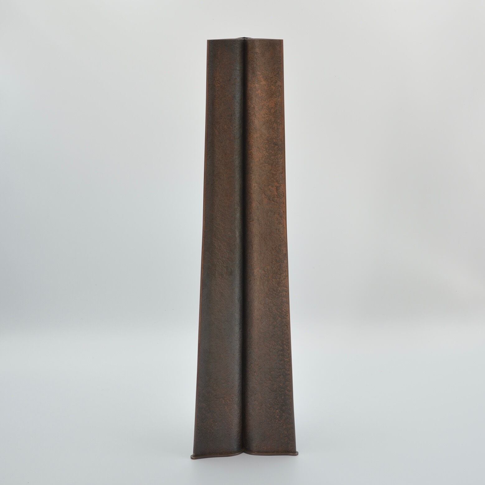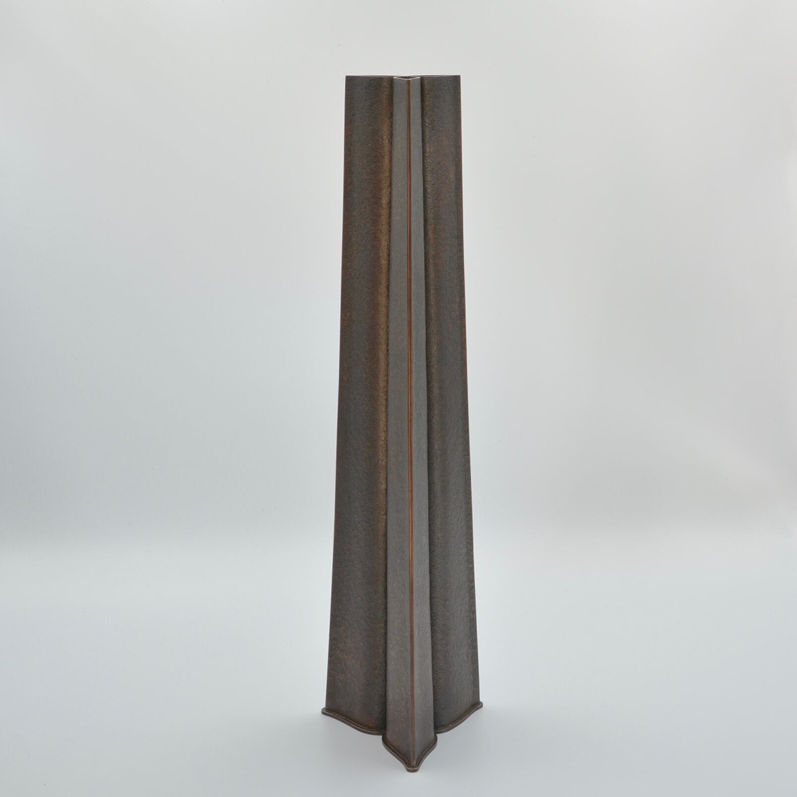 そびえ立つような姿の銅の花器シリーズ。銅板を金槌で丁寧に叩いて表面の模様を作っています。一輪挿しは切り口の形が美しく、オブジェとしても飾って頂けます。仕上げは硫化仕上げの後、蜜蝋を施し、自然な風合いを出しています。