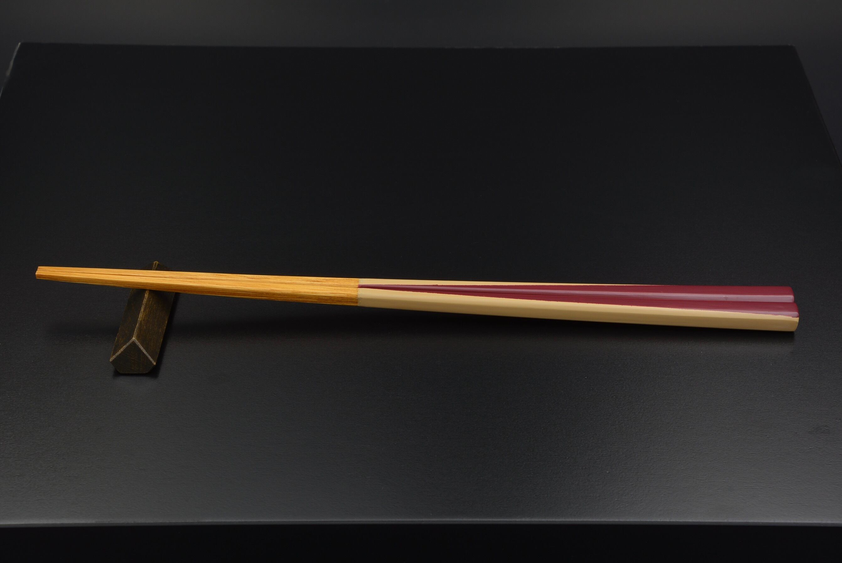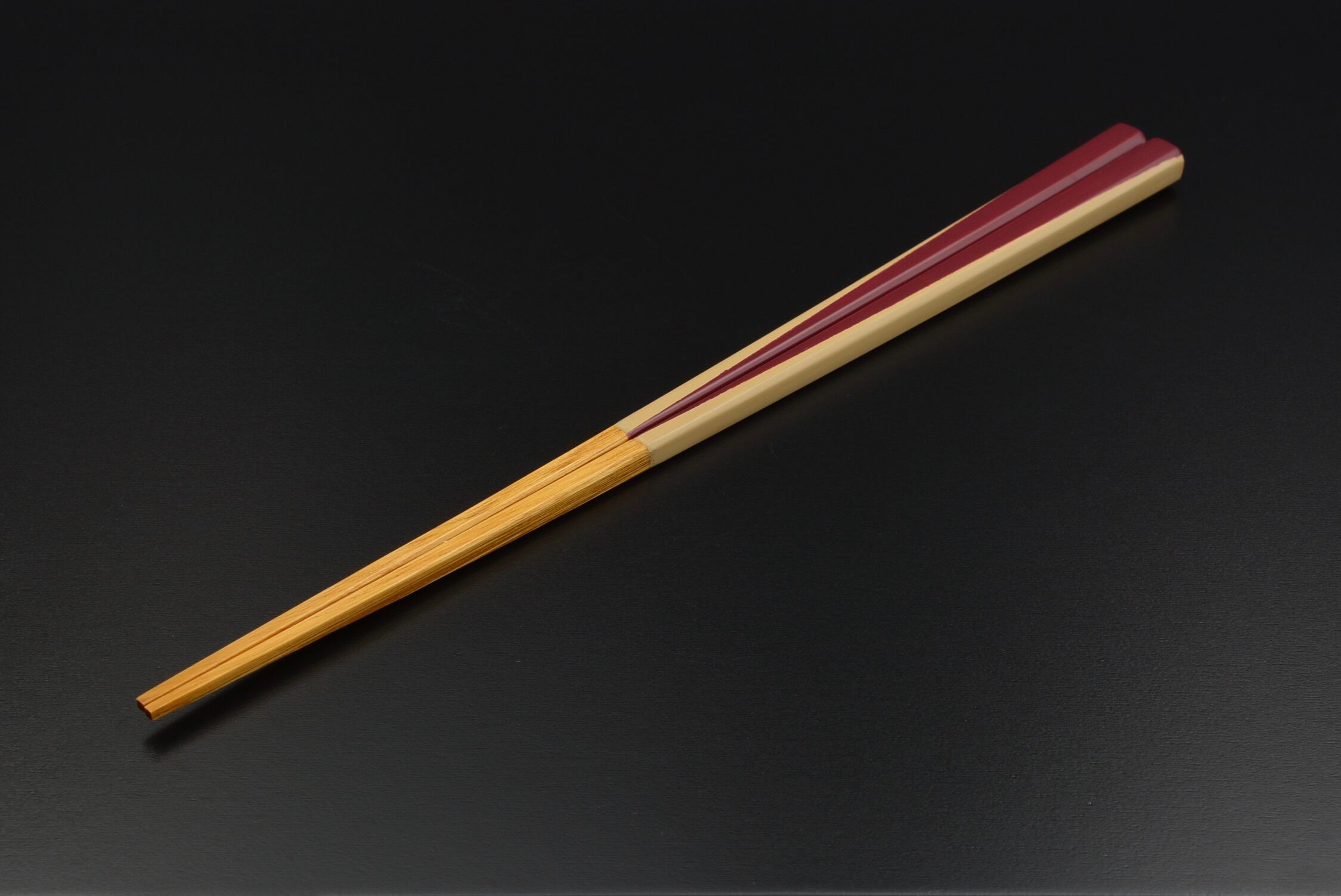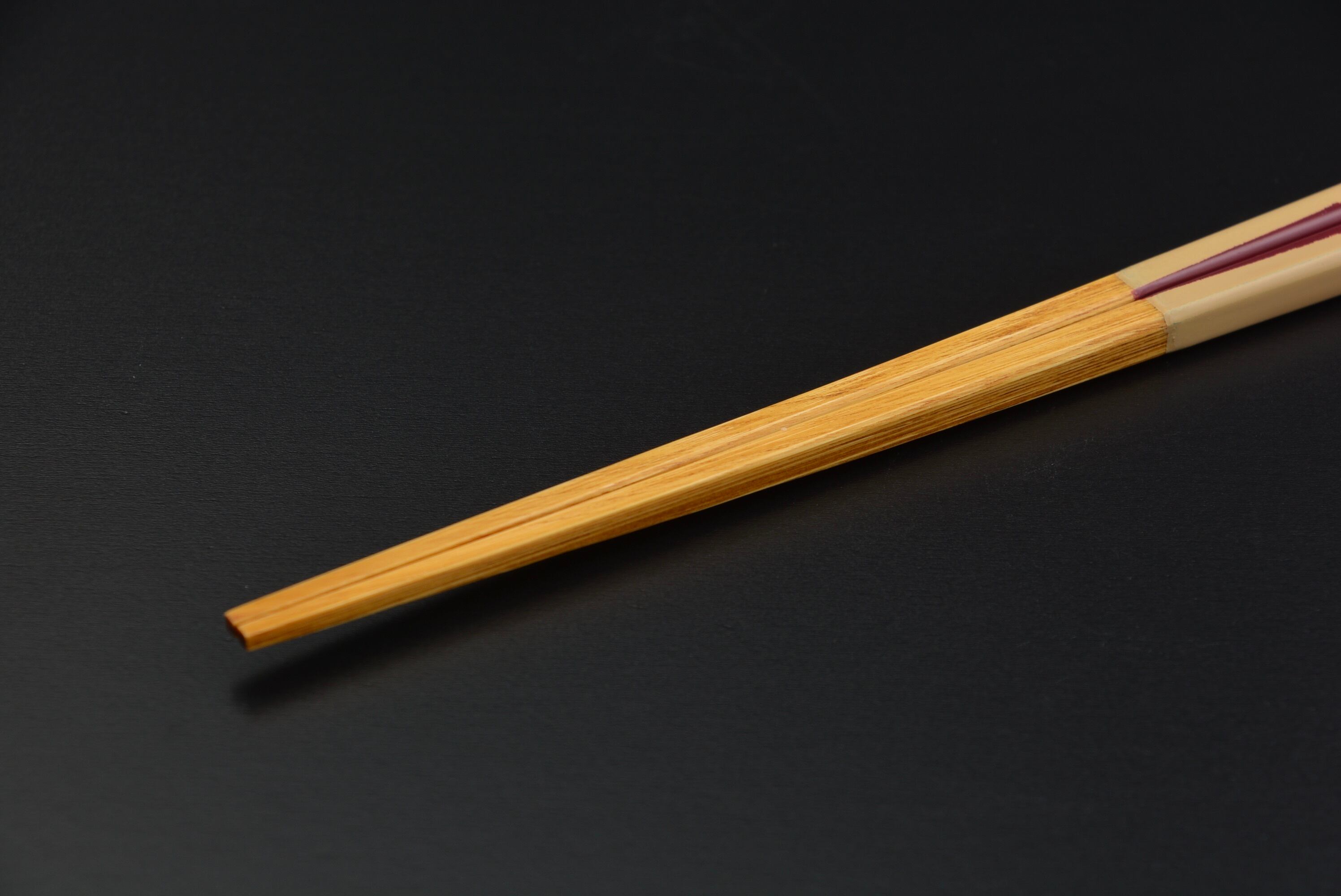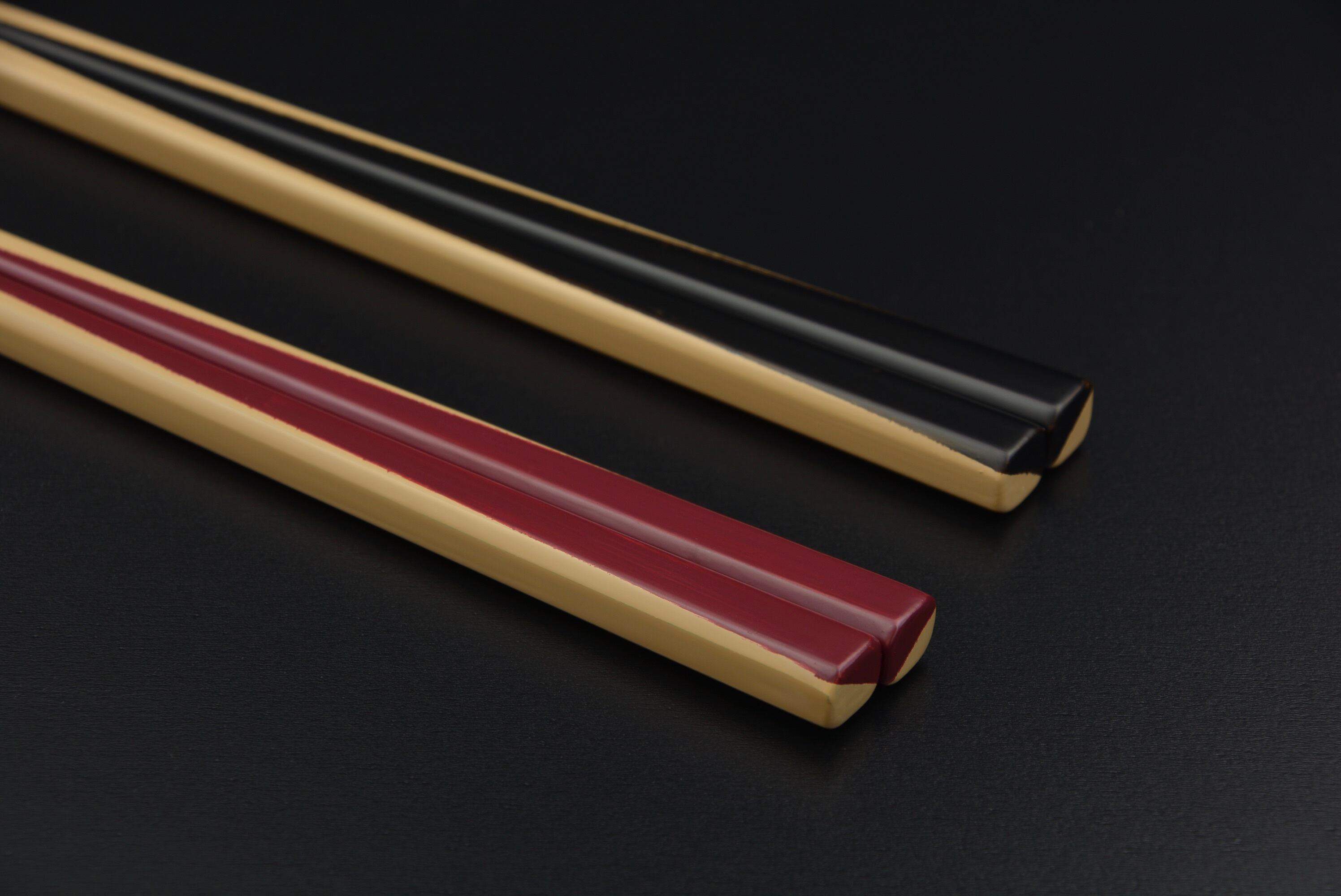 箸先全体にすり漆を7回重ね、持ち手部分には下地から塗りまで約10工程ほど重ねて仕上げています。